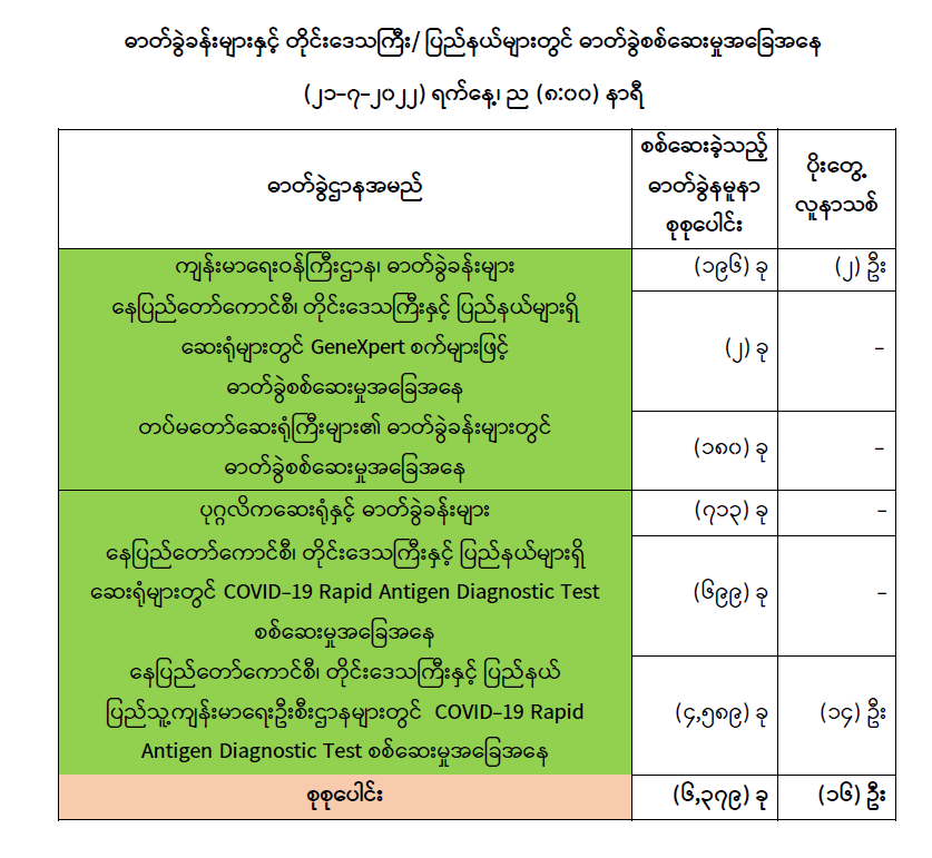 သို့ဖြစ်ပါ၍ ယနေ့အထိ ဓာတ်ခွဲနမူနာစုစုပေါင်း (၈,၄၇၉,၉၀၃) ခုအားစစ်ဆေးခဲ့ပြီး COVID-19 ဓာတ်ခွဲအတည်ပြုလူနာ စုစုပေါင်း (၆၁၃,၈၈၇) ဦး ရှိပြီ ဖြစ်ပါသည်။