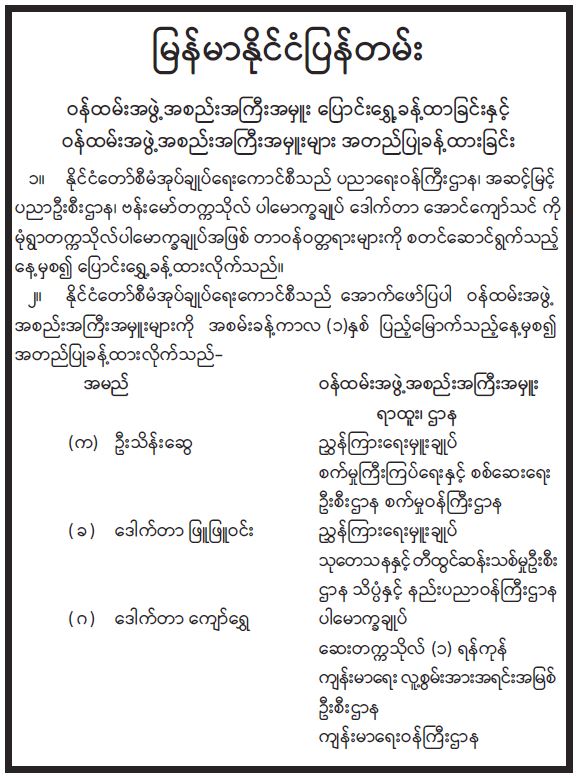 ဝန်ထမ်းအဖွဲ့အစည်းအကြီးအမှူး ပြောင်းရွှေ့ခန့်ထားခြင်းနှင့် ဝန်ထမ်းအဖွဲ့အစည်းအကြီးအမှူးများ အတည်ပြုခန့်ထားခြင်း