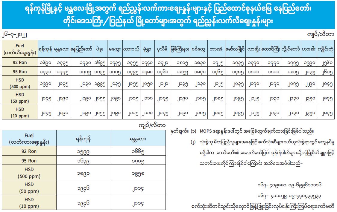 ရန်ကုန်မြို့နှင့် မန္တလေးမြို့အတွက် ရည်ညွှန်းလက်ကားဈေးနှုန်းများနှင့် ပြည်ထောင်စုနယ်မြေ နေပြည်တော်၊ တိုင်းဒေသကြီး/ပြည်နယ် မြို့တော်များအတွက် ရည်ညွှန်းလက်လီဈေးနှုန်းများ 07/26/2022