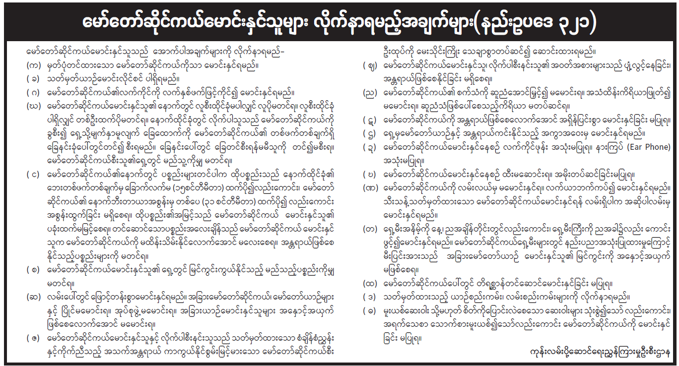 မော်တော်ဆိုင်ကယ်မောင်းနှင်သူများ လိုက်နာရမည့်အချက်များ (နည်းဥပဒေ ၃၂၁)
