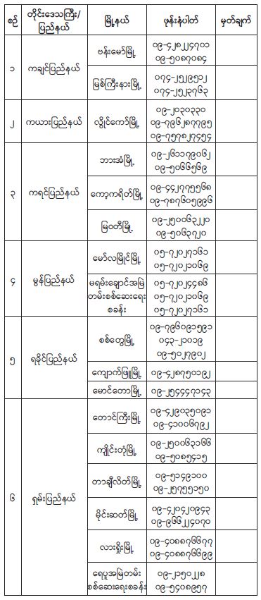 ၆။ သတင်းပေးဆက်သွယ် တိုင်ကြားနိုင်သည့် ဖုန်းနံပါတ်များမှာ အောက်ပါအတိုင်း ဖြစ်ပါသည်-