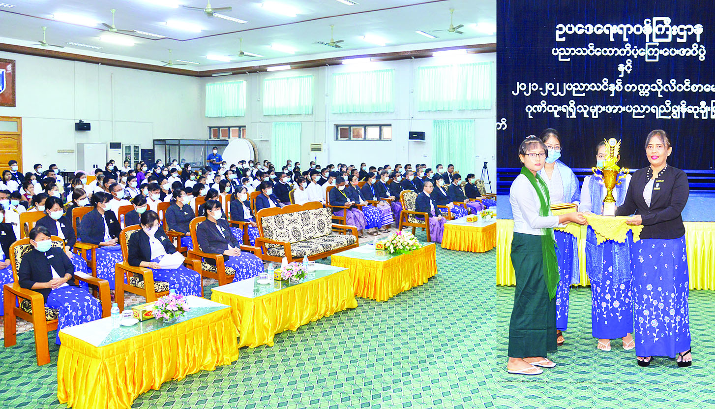 ထို့နောက် ပြည်ထောင်စုဝန်ကြီးက ၂၀၂၁-၂၀၂၂ ပညာသင်နှစ် တက္ကသိုလ်ဝင်စာမေးပွဲတွင် ထူးချွန်စွာအောင်မြင်ခဲ့သော ငါးဘာသာဂုဏ်ထူးရှင်ကိုလည်းကောင်း၊ ဒုတိယဝန်ကြီးနှင့် ဒုတိယရှေ့နေချုပ် ဦးစန်းလွင်က နှစ်ဘာသာဂုဏ်ထူးရှင်ကိုလည်းကောင်း၊ ညွှန်ကြားရေးမှူးချုပ်များက တစ်ဘာသာဂုဏ်ထူးရှင် ငါးဦးကိုလည်းကောင်း ဆုများပေးအပ် ချီးမြှင့်ခဲ့ကြသည်။