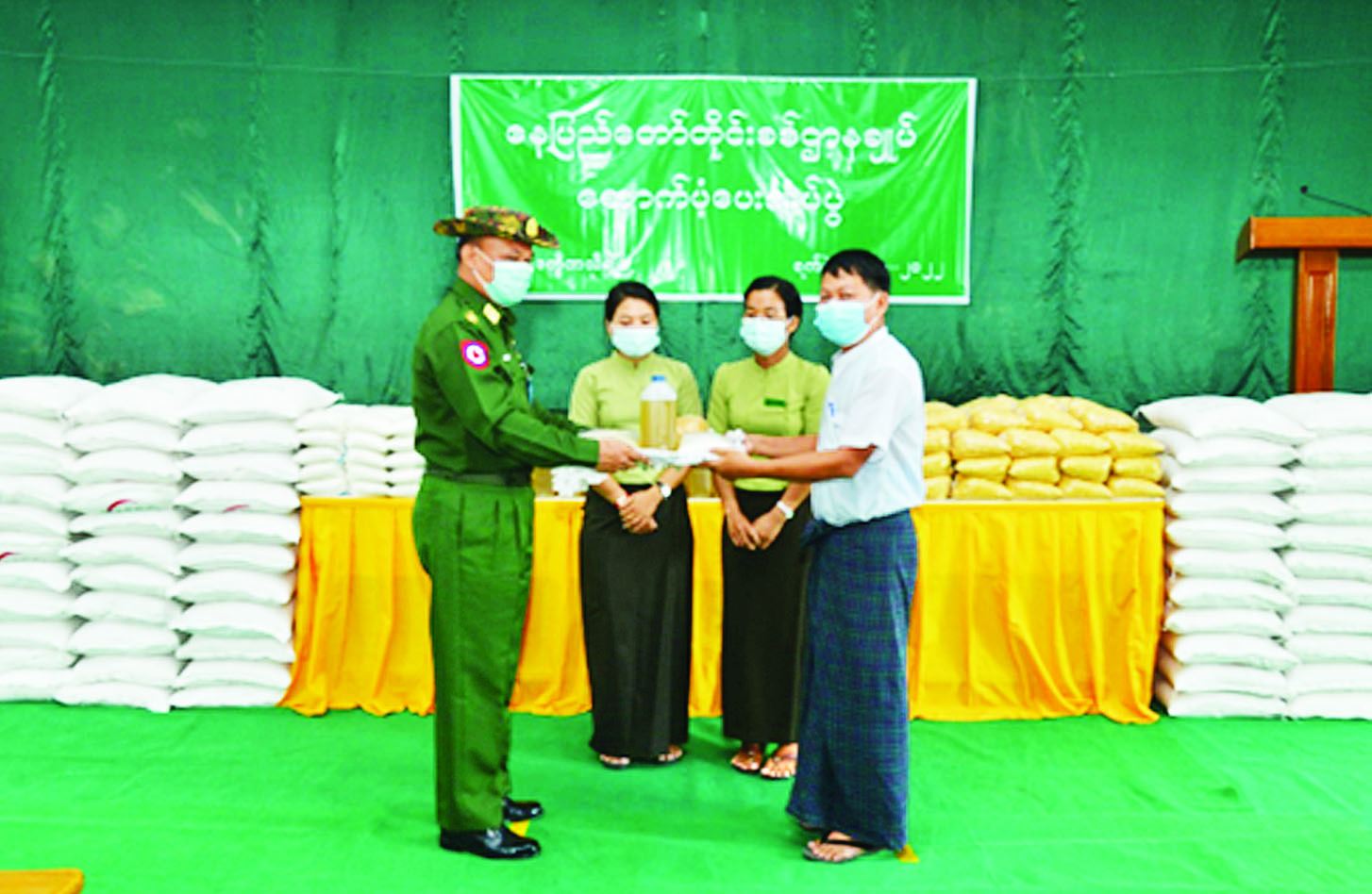 ကချင်ပြည်နယ်၊ ကယားပြည်နယ်၊ ချင်းပြည်နယ်၊ ရှမ်းပြည်နယ်၊ မကွေးတိုင်းဒေသကြီးနှင့် စစ်ကိုင်းတိုင်းဒေသကြီးအတွင်း၌ PDF အမည်ခံ အကြမ်းဖက်သမားများ၏ ခြိမ်းခြောက် အကြမ်းဖက်သတ်ဖြတ်မှု အန္တရာယ်မှ တိမ်းရှောင်လာကြသူများအား ဆန်၊ ဆီ၊ စားသောက်ဖွယ်ရာနှင့် ထောက်ပံ့ငွေများပေးအပ်ခြင်းကို ဇူလိုင် ၂၉ ရက် ညနေပိုင်းတွင် နေပြည်တော်ကောင်စီနယ်မြေ ဒက္ခိဏသီရိမြို့နယ်ရှိ အထွေထွေအုပ်ချုပ်ရေးဦးစီးဌာန မြို့နယ်အုပ်ချုပ်ရေးမှူးရုံး၌ ကျင်းပရာ နေပြည်တော်တိုင်းစစ်ဌာနချုပ် တိုင်းမှူး ဗိုလ်ချုပ်ဇော်ဟိန်းနှင့် ဌာနဆိုင်ရာတာဝန်ရှိသူများ၊ ခရိုင်/မြို့နယ်စီမံ အုပ်ချုပ်ရေးအဖွဲ့မှ တာဝန်ရှိသူများ၊ PDF အမည်ခံအကြမ်းဖက်သမားများ၏ ခြိမ်းခြောက် အကြမ်းဖက်သတ်ဖြတ်မှုအန္တရာယ်မှ တိမ်းရှောင်လာကြသူများ တက်ရောက်ကြသည်။