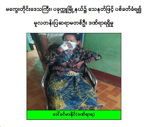 အလားတူ မွန်းလွဲ ၁၂ နာရီအချိန်တွင် ပခုက္ကူမြို့နယ်၊ ကမ္မမြို့၊ အမှတ်(၄)ရပ်ကွက်နေ သရက်ကန်အခြေခံပညာမူလတန်းကျောင်းမှ မူလတန်းပြ ဆရာမဖြစ်သူ ဒေါ်ခင်မာနိုင်(၃၈)နှစ် (ဘ) ဦးဘိုဆင့်သည် မြစ်ခြေ-ကမ္မကားလမ်းအတိုင်း သရက်ကန် အခြေခံပညာ မူလတန်းကျောင်းမှ ၎င်း၏နေအိမ်သို့ ဆိုင်ကယ်ဖြင့် ပြန်လာစဉ် လားရာတူ နောက်မှ ဆိုင်ကယ် မောင်းနှင်လာသည့် အကြမ်းဖက်သမားများက သေနတ်ဖြင့် ပစ်ခတ် ထွက်ပြေးသွားခဲ့သဖြင့် ဒေါ်ခင်မာနိုင်တွင် သေနတ်ထိမှန်ဒဏ်ရာများ ရရှိခဲ့သဖြင့် ဆေးဝါးကုသနိုင်ရေး ပခုက္ကူမြို့နယ် ပြည်သူ့ဆေးရုံသို့ ပို့ဆောင်ထားရှိကြောင်း သိရသည်။