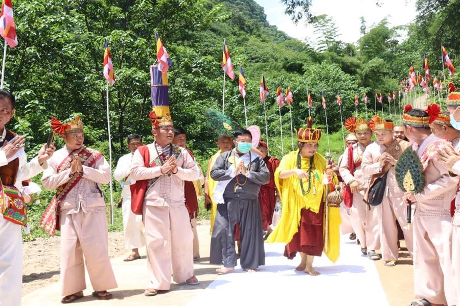 ထို့နောက် ပြည်နယ်ဝန်ကြီးချုပ်၊ တိုင်းမှူးနှင့် ဌာနဆိုင်ရာများ၊ ဒေသခံတိုင်းရင်းသားများက ဆရာတော်ကြီးအား မင်္ဂလာစုမ့်မိန်း ဝေါယာဉ်တော်အား ရှေ့မှ ကြိုးဖြင့် ဆွဲတော်မူ၍ နမ့်စင်ချောင်းသို့ ပင့်ဆောင်လာပြီး နမ့်စင်ချောင်းဘေးတွင် မိုင်းဖုန်းဆရာတော်ဘုရားကြီးက ဆံတော်ရိပ်ပယ်တော်မူပြီး တစ်ပါးထိုင်ကျောင်းတော်တွင် သီတင်းသုံးတော်မူကာ လူ၊ နတ်၊ ဗြဟ္မာသတ္တဝါအပေါင်းတို့အား မေတ္တာရေအေး တရားဓမ္မများချီးမြှင့်တော်မူရာ ပြည်နယ်ဝန်ကြီးချုပ်၊ တိုင်းမှူးနှင့် ဌာနဆိုင်ရာများ၊ ဒေသခံတိုင်းရင်းသားပြည်သူများက ဆရာတော်ကြီးအား ဝါဆိုသင်္ကန်းနှင့် လှူဖွယ်ပစ္စည်းများ ဆက်ကပ်လှူဒါန်းကြပြီး ဆရာတော်ကြီးထံမှ တရားဒေသနာတော်များကို နာယူခဲ့ကြသည်။