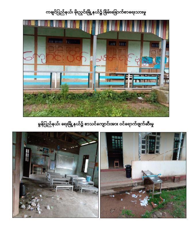 ထိုသို့ လုပ်ဆောင်လျက်ရှိရာ ဩဂုတ်လ ၁ ရက်နေ့ နံနက် ၆ နာရီခွဲအချိန်တွင် ကချင်ပြည်နယ်၊ မိုးညှင်းမြို့နယ်၊ ပန်းလားကျေးရွာရှိ အခြေခံပညာ အလယ်တန်းကျောင်းခွဲ၌ ခြိမ်းခြောက် စာများရေးသားထားကြောင်း သတင်းအရ လုံခြုံရေးတပ်ဖွဲ့ဝင်များက သွားရောက်စစ်ဆေးခဲ့ရာ အဆိုပါ စာသင်ကျောင်းဝင်းအတွင်းရှိ Grade-5 စာသင်ခန်းနံရံပေါ်တွင် မှုတ်ဆေးအနီဖြင့် ခြိမ်းခြောက်စာများ ရေးထားသားသည်ကို တွေ့ရှိရသဖြင့် ဖယ်ရှားရှင်းလင်းခဲ့ကြောင်း သိရသည်။