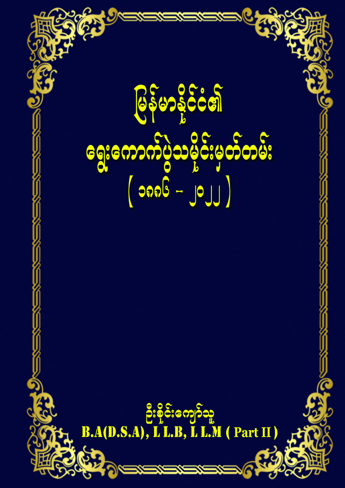 ဦးစိုင်းကျော်သူရေးသားသော “မြန်မာနိုင်ငံ၏ ရွေးကောက်ပွဲသမိုင်းမှတ်တမ်း (၁၈၈၆ - ၂၀၂၂)” စာအုပ်ထွက်ရှိလာသည်။ စာအုပ်တွင် မြန်မာနိုင်ငံသည် ၁၈၈၆ ခုနှစ် လွတ်လပ်ရေး ဆုံးရှုံးပြီးနောက် ပထမဆုံး ရွေးကောက်ပွဲ စတင်ကျင်းပခဲ့သည့် ၁၉၂၂ ခုနှစ်မှစ၍ ၂၀၂၀ ပြည့်နှစ်အထိ ကျင်းပခဲ့သော အထွေထွေရွေးကောက်ပွဲ ၁၇ ကြိမ်၊ ကြားဖြတ်ရွေးကောက်ပွဲ သုံးကြိမ်၊ ပြည်လုံးကျွတ်ဆန္ဒခံယူပွဲ နှစ်ကြိမ်၊ ပြဋ္ဌာန်းခဲ့သော ဖွဲ့စည်းပုံအခြေခံဥပဒေ သုံးမျိုးတို့နှင့် ယနေ့မျက်မှောက်အချိန် ရွေးကောက်ပွဲ အလွန်ကာလ ၂၀၂၂ ခုနှစ်အထိ ဖြစ်စဉ်ဖြစ်ရပ်များကို ရေးသားထားသည်။ ထို့အပြင် နိုင်ငံရေးပါတီများ တည်ထောင်ခြင်း၊ ပယ်ဖျက်ခြင်း၊ ပူးပေါင်းဖွဲ့စည်းခြင်းများနှင့် ရွေးကောက်ပွဲများတွင် ဝင်ရောက် ယှဉ်ပြိုင်မှုအခြေအနေ၊ ရွေးကောက်ပွဲများတွင် ရွေးကောက်တင်မြှောက်ခံရသော နိုင်ငံရေးပါတီများ၊ အမတ်များ/လွှတ်တော် ကိုယ်စားလှယ်များ၊ ရွေးကောက်ပွဲများတွင် တင်သွင်းလာသော ကန့်ကွက်လွှာအမှုများနှင့် အနိုင်အရှုံး ရလဒ်များ၊ ရွေးကောက် ပွဲနှင့်စပ်လျဉ်း၍ ပြဋ္ဌာန်းခဲ့သော ဥပဒေ၊ နည်းဥပဒေ များကို အခန်းရှစ်ခန်းခွဲ၍ ရေးသားထားပါသည်။ ၁၈၈၆ ခုနှစ်မှ ၂၀၂၂ ခုနှစ်အထိ နှစ်ပေါင်း ၁၃၆ နှစ် အတွင်း မြန်မာနိုင်ငံ၏ ရွေးကောက်ပွဲများနှင့် စပ်လျဉ်း၍ ဖြစ်စဉ်၊ ဖြစ်ရပ်များ၊ အကြောင်းအရာစုံလင်စွာဖော်ပြ ထားသော စာအုပ်ဖြစ်၍ နိုင်ငံသားတိုင်းဖတ်ရှု လေ့လာသင့်သော စာအုပ်ဖြစ်သည်။