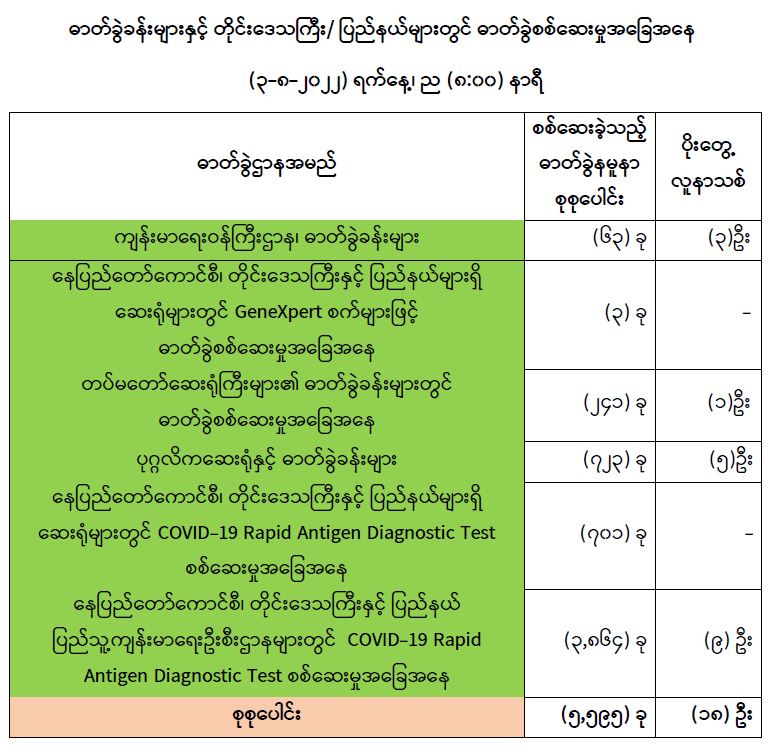 သို့ဖြစ်ပါ၍ ယနေ့အထိ ဓာတ်ခွဲနမူနာစုစုပေါင်း (၈,၅၅၃,၃၃၃) ခုအားစစ်ဆေးခဲ့ပြီး COVID-19 ဓာတ်ခွဲအတည်ပြုလူနာ စုစုပေါင်း (၆၁၄,၁၄၆) ဦး ရှိပြီဖြစ်ပါသည်။