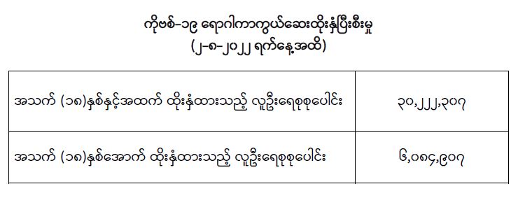 COVID-19 ရောဂါကာကွယ်ထိန်းချုပ်ရေးအတွက် တိုင်းဒေသကြီး/ပြည်နယ်များတွင် COVID-19 ရောဂါကာကွယ်ဆေးကို ဦးတည်အုပ်စုများသတ်မှတ်၍ ထိုးနှံပေးလျက်ရှိရာ (၂-၈-၂၀၂၂) ရက်နေ့အထိ အသက် (၁၈) နှစ်နှင့်အထက် လူဦးရေစုစုပေါင်း (၃၀,၂၂၂,၃၀၇) ဦး နှင့် အသက် (၁၈) နှစ်အောက် လူဦးရေစုစုပေါင်း (၆,၀၈၄,၉၀၇) ဦးတို့အား ထိုးနှံထားရှိပြီးဖြစ်ပါသည်။