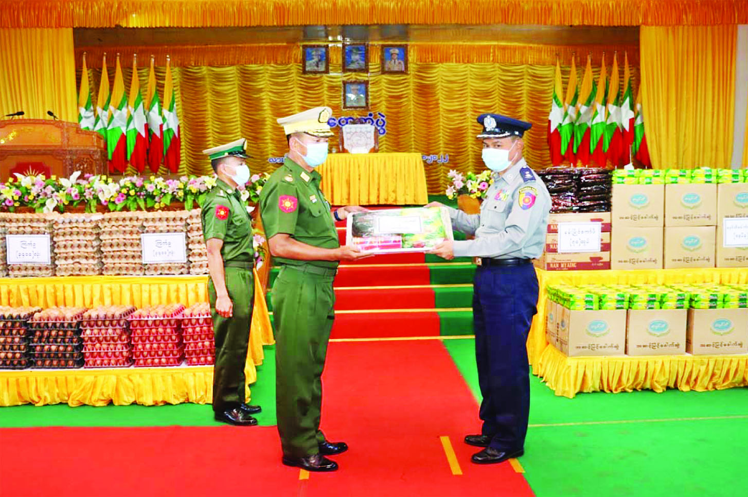 ရှမ်းပြည်နယ် (မြောက်ပိုင်း) လားရှိုးမြို့နယ်ရှိ တပ်မတော်သားများ၊ စစ်မှုထမ်းဟောင်းအဖွဲ့ဝင်များ၊ မြန်မာနိုင်ငံရဲတပ်ဖွဲ့ဝင်များနှင့် ပြည်သူ့စစ်(ဌာနေ) တပ်ဖွဲ့ဝင်များအား စားသောက်ဖွယ်ရာများ ထောက်ပံ့ပေးအပ်ခြင်းကို ယနေ့မွန်းလွဲပိုင်းတွင် အရှေ့မြောက်တိုင်းစစ်ဌာနချုပ် တိုင်းခန်းမ၌ကျင်းပရာ တိုင်းမှူး ဗိုလ်ချုပ် နိုင်နိုင်ဦးနှင့် ဌာနဆိုင်ရာတာဝန်ရှိသူများ၊ လုံခြုံရေးတပ်ဖွဲ့ဝင်များနှင့် ဖိတ်ကြားထားသူများ တက်ရောက်ကြသည်။