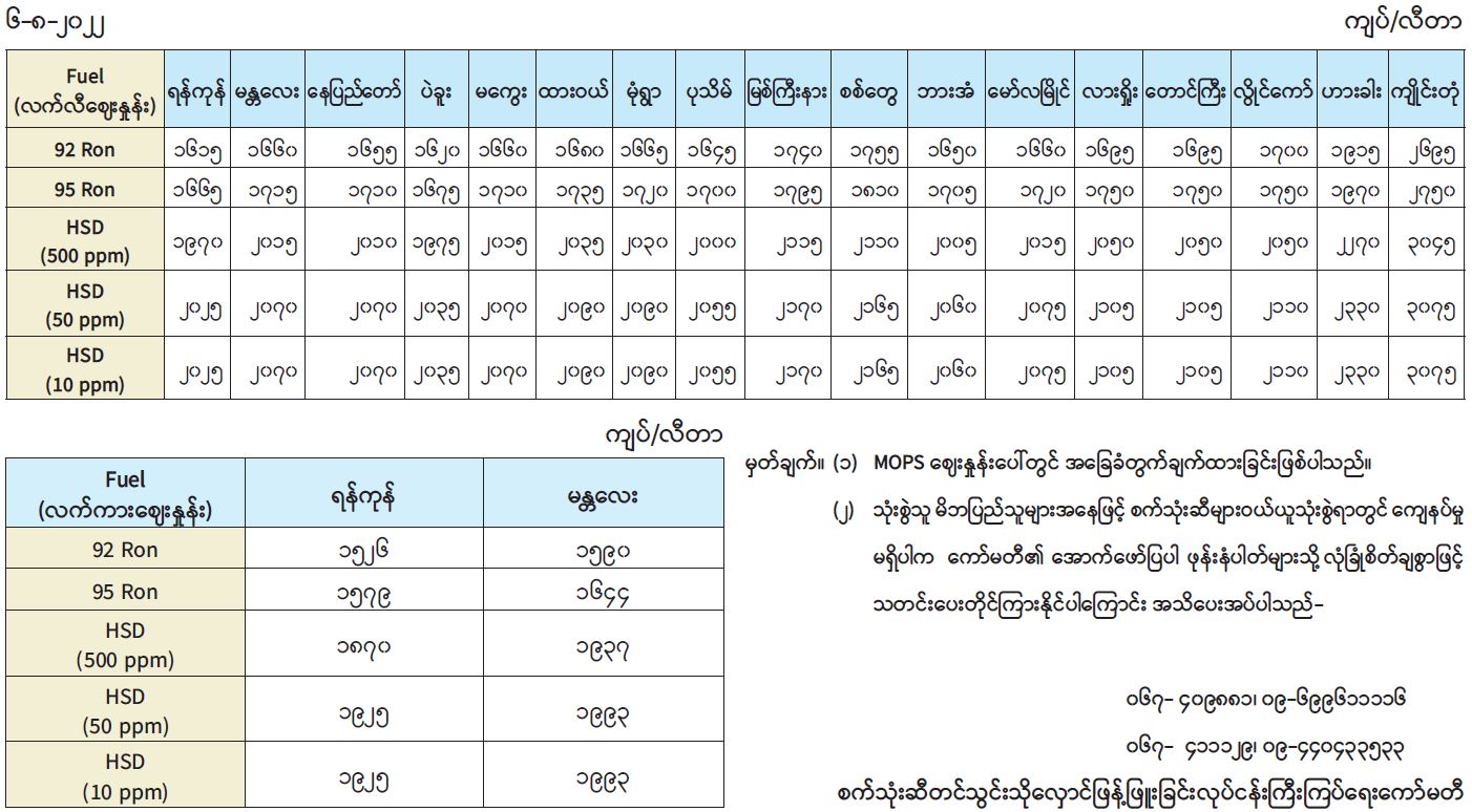 ရန်ကုန်မြို့နှင့် မန္တလေးမြို့အတွက် ရည်ညွှန်းလက်ကားဈေးနှုန်းများနှင့် ပြည်ထောင်စုနယ်မြေ နေပြည်တော်၊ တိုင်းဒေသကြီး/ပြည်နယ် မြို့တော်များအတွက် ရည်ညွှန်းလက်လီဈေးနှုန်းများ