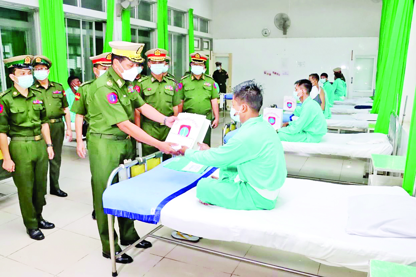 ကချင်ပြည်နယ် မြစ်ကြီးနားမြို့ရှိ တပ်မတော်ဆေးရုံ၊ ရှမ်းပြည်နယ်(မြောက်ပိုင်း) လားရှိုးမြို့ရှိ တပ်မတော်ဆေးရုံ၊ ရှမ်းပြည်နယ်(တောင်ပိုင်း) တောင်ကြီးမြို့ရှိ တပ်မတော်ဆေးရုံ၊ ရှမ်းပြည်နယ်(အရှေ့ပိုင်း) ကျိုင်းတုံမြို့ရှိ တပ်မတော်ဆေးရုံနှင့် ဧရာဝတီတိုင်းဒေသကြီး ပုသိမ်မြို့ရှိ နယ်မြေခံဆေးတပ်ရင်းတို့၌ တက်ရောက်ကုသမှုခံယူလျက်ရှိသည့် အရာရှိ၊ စစ်သည်၊ မိသားစုများ၊ စစ်မှုထမ်းဟောင်းအဖွဲ့ဝင်များ၊ ပြည်သူ့စစ်(ဌာနေ)တပ်ဖွဲ့ဝင်များနှင့် ဒေသခံပြည်သူများအား ယနေ့တွင် သက်ဆိုင်ရာတိုင်းစစ်ဌာနချုပ်များမှ တိုင်းမှူးများနှင့် အဖွဲ့ဝင်များက သွားရောက်ကြည့်ရှု၍ တစ်ဦးချင်း ရောဂါဖြစ်ပွားမှု၊ ဆေးဝါးကုသပေးထားမှုနှင့် ကျန်းမာရေးတိုးတက်မှု အခြေအနေများကို ရင်းရင်းနှီးနှီး မေးမြန်းအားပေးစကားပြောကြားပြီး ဂုဏ်ပြုချီးမြှင့်ငွေများနှင့် စားသောက်ဖွယ်ရာများ ပေးအပ်သည်။