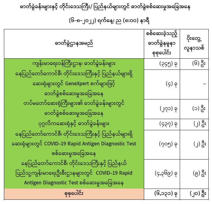 သို့ဖြစ်ပါ၍ ယနေ့အထိ ဓာတ်ခွဲနမူနာစုစုပေါင်း (၈,၅၇၁,၉၄၂)ခုအား စစ်ဆေးခဲ့ပြီး COVID-19 ဓာတ်ခွဲအတည်ပြုလူနာ စုစုပေါင်း (၆၁၄,၁၉၀) ဦး ရှိပြီ ဖြစ်ပါသည်။