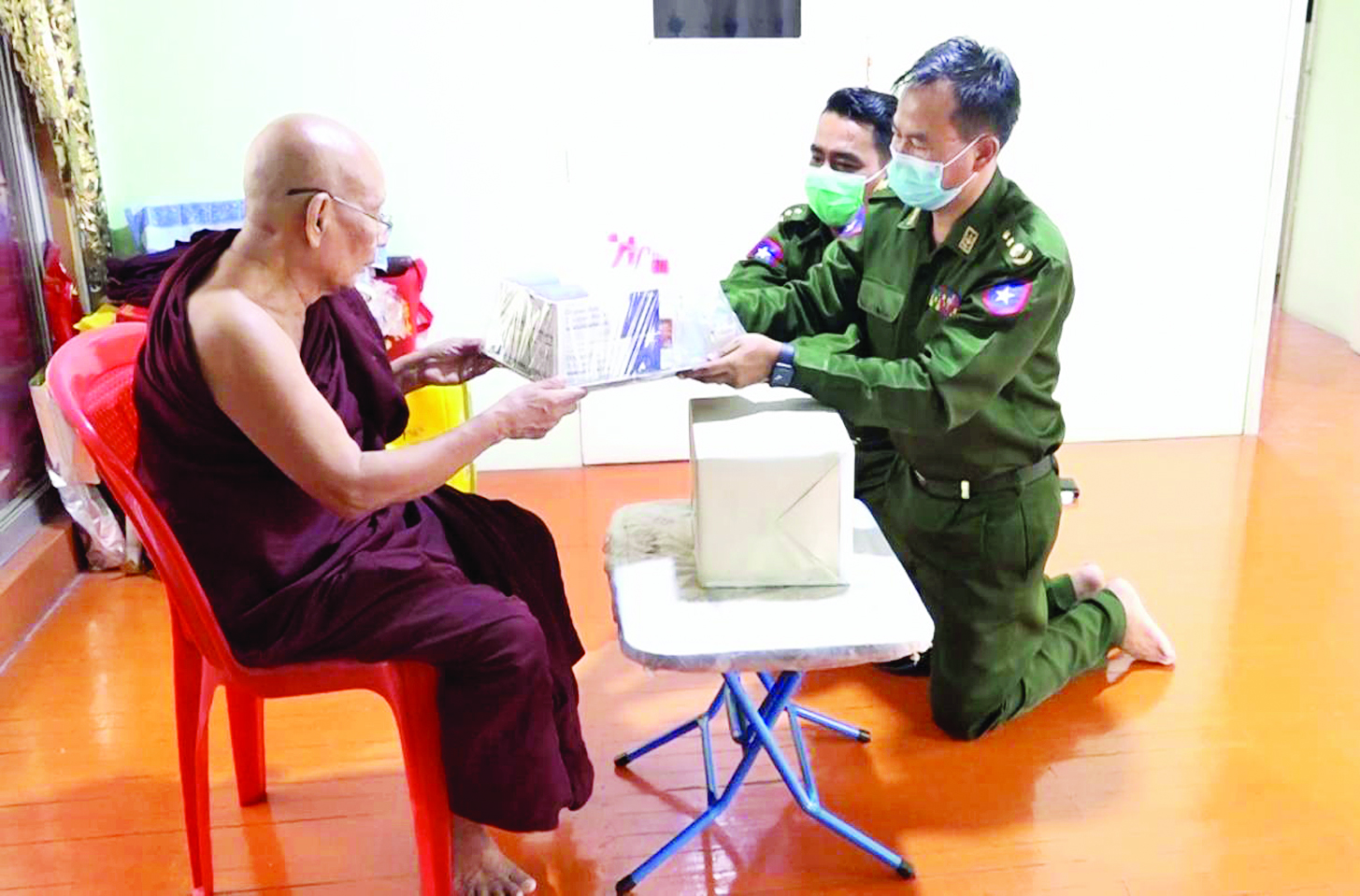 ထိုသို့ဆောင်ရွက်လျက်ရှိရာ ယနေ့တွင် ရန်ကုန်တိုင်းဒေသကြီး အင်းစိန်မြို့နယ် အောင်ဆန်းရပ်ကွက်ရှိ သာသနဝေပုလ္လကာရီ ကျောင်းတိုက်၊ မှော်ဘီမြို့နယ် နှောကုန်းကျေးရွာရှိ အောင်ဘုန်းပွင့်ကမ္မဋ္ဌာန်းကျောင်းတိုက်၊ ဧရာဝတီတိုင်းဒေသကြီး မော်လမြိုင်ကျွန်းမြို့ မိုးညိုကျောင်း ပရိယတ္တိစာသင်တိုက်၊ မန္တလေးတိုင်းဒေသကြီး အောင်မြေသာစံမြို့နယ် မဟာဝိသုဒ္ဓါရာမတိုက်ရှိ သာသနပါလကျောင်း၊ မကွေးတိုင်းဒေသကြီး သရက် မြို့နယ် ကိုးပင်ကျေးရွာဘုန်းတော်ကြီးကျောင်း၊ အောင်လံမြို့ ရွာထောင်ရပ်ကွက်ရှိ သီတဂူဇောတိက ဝိပဿနာတက္ကသိုလ်၊ သမ္ဘူလကျေးရွာရှိ မိုးကုတ် ဝိပဿနာသဒ္ဓမ္မဂုဏ်ရည် ဓမ္မရိပ်သာ ကျောင်းတိုက်နှင့် ဆင်ပေါင်ဝဲမြို့နယ် ကျောက်ဆောင်စမ်းကျေးရွာရှိ ဒက္ခိနာရုံကျောင်းတိုက်တို့မှ သံဃာတော်များနှင့် သာသနာ့နွယ်ဝင်သီလရှင်များအား ဆွမ်းဆန်တော်၊ ဆီ၊ ဆား၊ ပဲ အမယ်လေးမျိုး၊ နဝကမ္မအလှူငွေများ၊ ကိုဗစ်-၁၉ ရောဂါ ကာကွယ်ရေး အထောက်အကူပြု ပစ္စည်းများ၊ နေ့ဆွမ်းများနှင့် လှူဖွယ်ပစ္စည်းများကို တိုင်းစစ်ဌာနချုပ်အသီးသီးမှ တာဝန်ရှိသူများက သွားရောက်ဆက်ကပ်လှူဒါန်းကြပြီး နယ်မြေခံဆေးအဖွဲ့များက လိုအပ်သည့် ကျန်းမာရေးစစ်ဆေး ပေးခြင်းများ ဆောင်ရွက်ပေးခဲ့ကြောင်း သိရသည်။