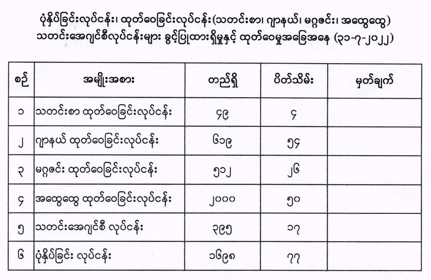 ပုံနှိပ်ခြင်းလုပ်ငန်း၊ ထုတ်ဝေခြင်းလုပ်ငန်း (သတင်းစာ၊ ဂျာနယ်၊ မဂ္ဂဇင်း၊ အထွေထွေ) သတင်းအေဂျင်စီလုပ်ငန်းများ ခွင့်ပြုထားရှိမှုနှင့် ထုတ်ဝေမှုအခြေအနေ(၃၁-၇-၂၀၂၂)