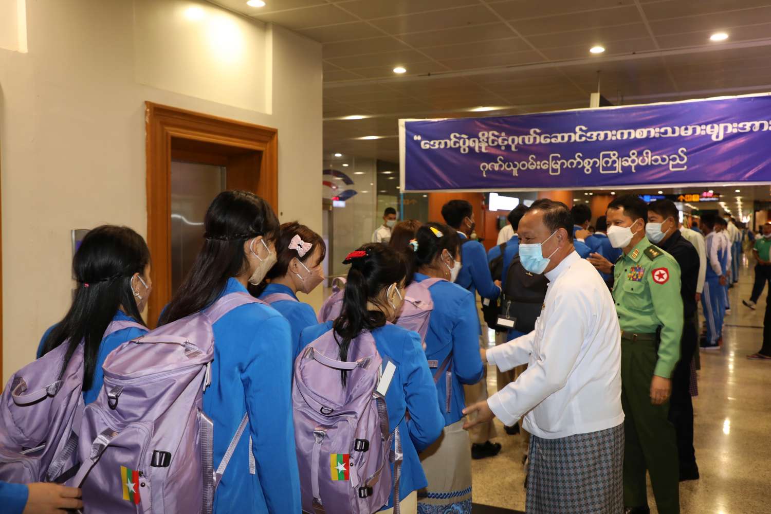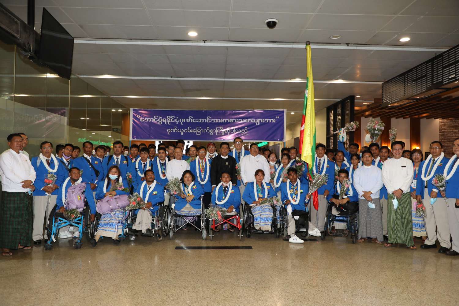 အင်ဒိုနီးရှားသမ္မတနိုင်ငံ၊ ဆိုလိုမြို့၌ ဇူလိုင် ၃၀ ရက်မှ သြဂုတ် ၆ ရက်အထိ ကျင်းပခဲ့သည့် (၁၁)ကြိမ်မြောက်အာဆီယံမသန်စွမ်းသူများ အားကစားပြိုင်ပွဲတွင် ရွှေတံဆိပ်(၁၄)ခု၊ ငွေတံဆိပ်(၁၂)ခု၊ ကြေးတံဆိပ်(၁၇)ခု၊ နိုင်ငံအလိုက်အဆင့်(၆)ရရှိခဲ့သည့် မြန်မာနိုင်ငံကိုယ်စားပြု အောင်ပွဲရ မြန်မာနိုင်ငံမသန်စွမ်းသူများ အားကစားအဖွဲ့သည် ယနေ့နံနက် ၅ နာရီခွဲက မြန်မာအမျိုးသားလေကြောင်းလိုင်း စင်းလုံးငှားလေယာဉ်ဖြင့် ရန်ကုန်အပြည်ပြည်ဆိုင်ရာလေဆိပ်သို့ ပြန်လည်ရောက်ရှိသည်။