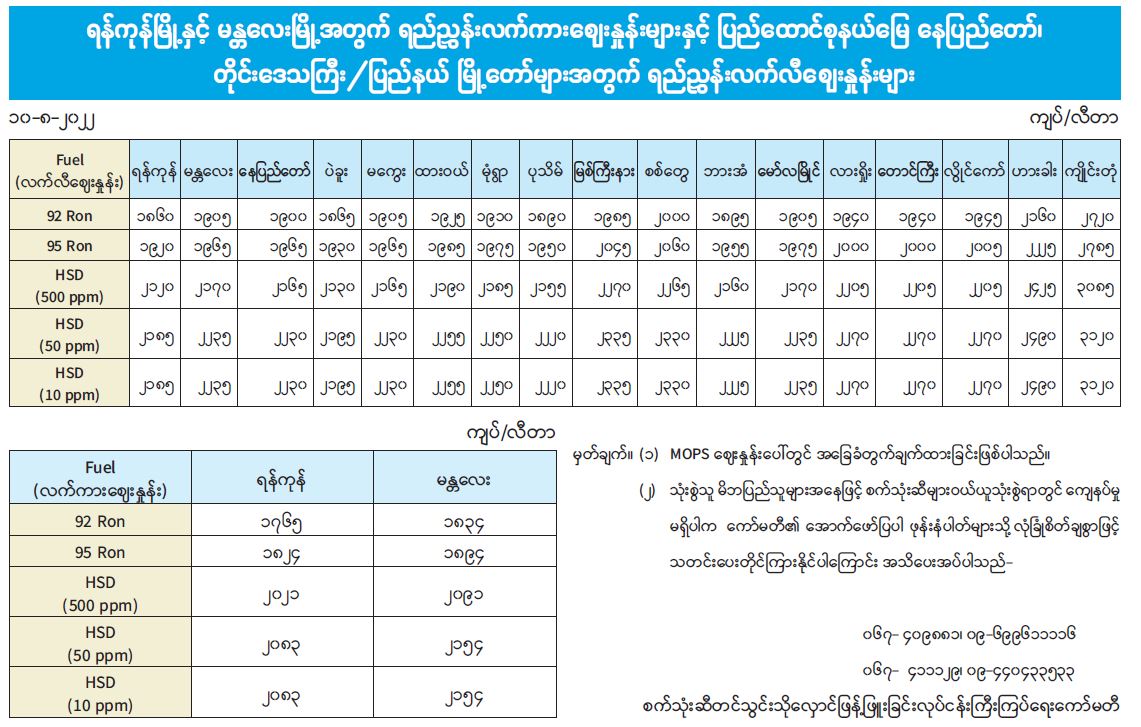 ရန်ကုန်မြို့နှင့် မန္တလေးမြို့အတွက် ရည်ညွှန်းလက်ကားဈေးနှုန်းများနှင့် ပြည်ထောင်စုနယ်မြေ နေပြည်တော်၊ တိုင်းဒေသကြီး/ပြည်နယ် မြို့တော်များအတွက် ရည်ညွှန်းလက်လီဈေးနှုန်းများ 08/10/2022