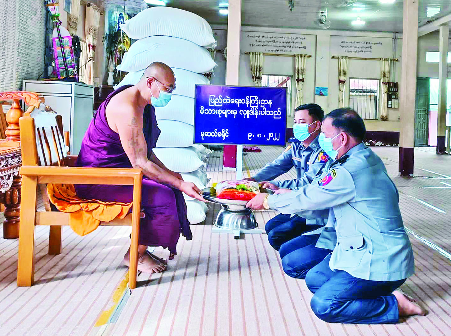 ပြည်ထဲရေးဝန်ကြီးဌာန တပ်ဖွဲ့ဝင်/ဝန်ထမ်းအရာထမ်း၊ အမှုထမ်းမိသားစုများက မြို့နယ်အသီးသီးရှိ ဘုန်းတော်ကြီးကျောင်းများသို့ ဆွမ်းဆန်တော်များ ဆက်ကပ်လှူဒါန်းလျက်ရှိသည်။