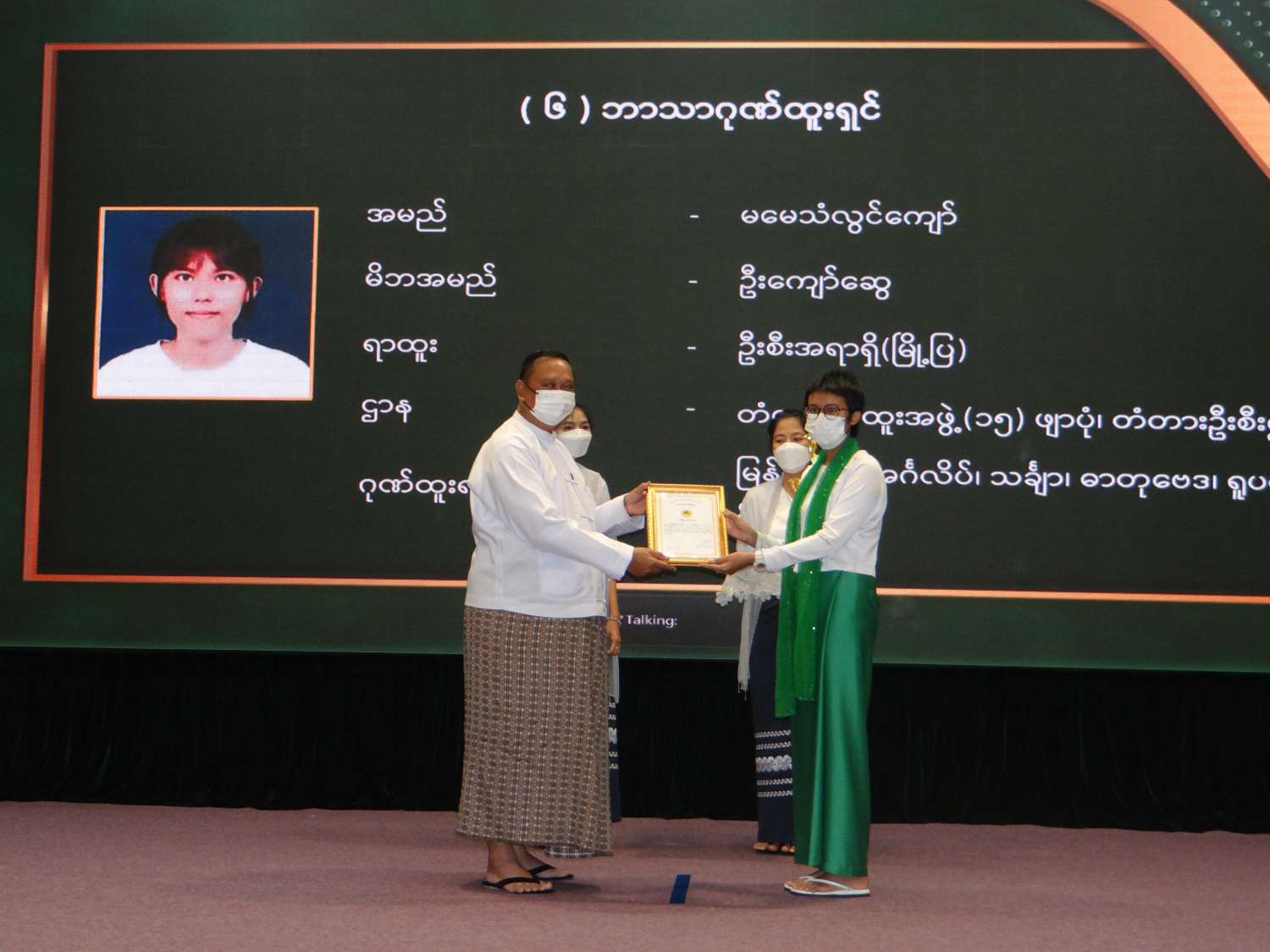 ဆက်လက်၍ ဒုတိယဝန်ကြီး ဦးဝင်းဖေနှင့်ဇနီးတို့က ငါးဘာသာဂုဏ်ထူးရှင် နှစ်ဦးကို ဂုဏ်ပြုဆုနှင့် ဂုဏ်ပြုမှတ်တမ်းလွှာများ ပေးအပ်သည်။