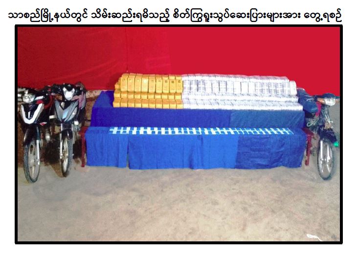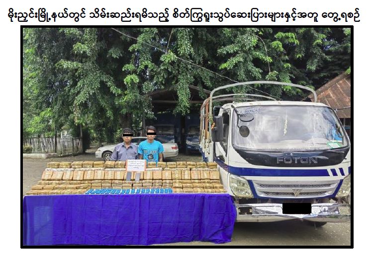 ကချင်ပြည်နယ်၊ မိုးညှင်းမြို့နယ်နှင့် မန္တလေးတိုင်းဒေသကြီး၊ သာစည်မြို့နယ်တို့တွင် ငွေကျပ် ၆ ဒသမ ၆၃ ဘီလီယံကျော်တန်ဖိုးရှိ စိတ်ကြွရူးသွပ်ဆေးပြား ၄၄ ဒသမ ၂ သိန်းကျော် ဖမ်းဆီးရမိ