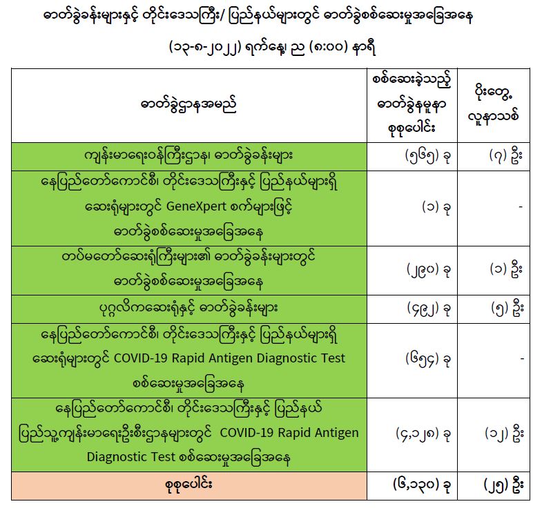 COVID-19 သံသယလူနာများ၊ ဓာတ်ခွဲအတည်ပြုလူနာနှင့် အနီးကပ်ထိတွေ့ခဲ့သူများနှင့် အသွားအလာကန့်သတ်ထားရှိသူများအား COVID-19 ရောဂါ ရှိ၊ မရှိ ဓာတ်ခွဲစစ်ဆေးခြင်း ပုံမှန်ဆောင်ရွက်လျက်ရှိပြီး (၁၂-၈-၂၀၂၂) ရက်နေ့၊ ည (၈:၀၀) နာရီမှ (၁၃-၈-၂၀၂၂) ရက်နေ့၊ ည (၈:၀၀) နာရီအတွင်း ဓာတ်ခွဲနမူနာစုစုပေါင်း(၆,၁၃၀)ခုအား စစ်ဆေးပြီးစီးခဲ့ရာ COVID-19 ရောဂါ ဓာတ်ခွဲအတည်ပြုလူနာသစ် (၂၅)ဦး တွေ့ရှိရပါသည်။ ထို့ကြောင့် ယနေ့အတွက် ရောဂါပိုးတွေ့ရှိမှု ရာခိုင်နှုန်းမှာ (၀.၄၁) ရာခိုင်နှုန်းရှိပါသည်။