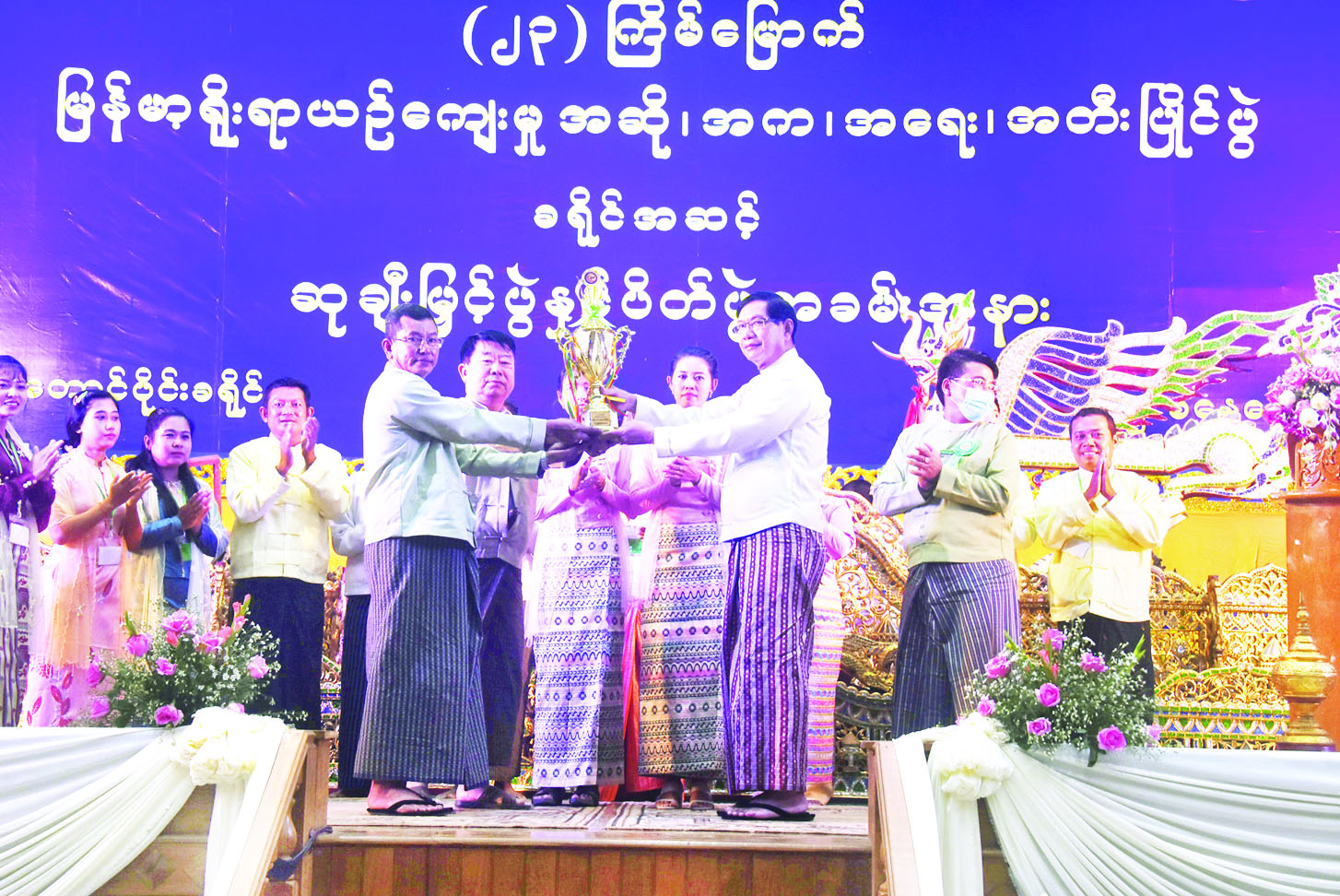 ယင်းနောက် အဆို၊ အက၊ အရေး၊ အတီး ခရိုင်အဆင့်ပြိုင်ပွဲတွင် ဘာသာရပ်အလိုက်အကဲဖြတ်ပေးကြသည့် ဒိုင်အဖွဲ့များနှင့် ပံ့ပိုးကူညီအကြံပြုသူများကို တာဝန်ရှိသူများက ဂုဏ်ပြုလက်ဆောင်ပစ္စည်းများ ပေးအပ်ချီးမြှင့်သည်၊၊