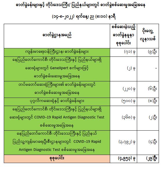 သို့ဖြစ်ပါ၍ ယနေ့အထိ ဓာတ်ခွဲနမူနာစုစုပေါင်း (၈,၆၁၇,၈၀၆) ခုအားစစ်ဆေးခဲ့ပြီး COVID-19 ဓာတ်ခွဲအတည်ပြုလူနာ စုစုပေါင်း (၆၁၄,၃၈၉) ဦး ရှိပြီဖြစ်ပါသည်။