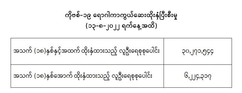 COVID-19 ရောဂါ ကာကွယ်ထိန်းချုပ်ရေးအတွက် တိုင်းဒေသကြီး/ပြည်နယ်များတွင် COVID-19 ရောဂါကာကွယ်ဆေးကို ဦးတည်အုပ်စုများသတ်မှတ်၍ ထိုးနှံပေးလျက်ရှိရာ (၁၃--၂၀၂၂) ရက်နေ့ အထိ အသက် (၁၈) နှစ်နှင့်အထက် လူဦးရေစုစုပေါင်း (၃၀,၂၇၁,၅၄၄) ဦးနှင့် အသက် (၁၈) နှစ်အောက် လူဦးရေစုစုပေါင်း (၆,၂၂၄,၃၁၇) ဦးတို့အား ထိုးနှံထားရှိပြီး ဖြစ်ပါသည်။