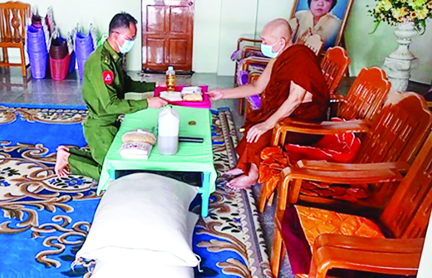 ကိုဗစ်-၁၉ ရောဂါ ကြိုတင်ကာကွယ်ရေး လုပ်ငန်းများ ဆောင်ရွက်နေသည့် ကာလအတွင်း ဆွမ်းကိစ္စရပ်များ အဆင်ပြေစေရန်ရည်ရွယ်၍ တပ်မတော် (ကြည်း၊ ရေ၊ လေ) အရာရှိ၊ စစ်သည်၊ အရာထမ်း၊ အမှုထမ်းများနှင့် စေတနာရှင်အလှူရှင်များက မြို့နယ်အသီးသီးရှိ ဘုန်းတော်ကြီးကျောင်းများ၊ သာသနာ့နွယ်ဝင် သီလရှင်ကျောင်းများနှင့် ဘာသာရေးကျောင်းများသို့ ဆွမ်း ဆန်တော်၊ ဆီ၊ ဆား၊ ပဲ အမယ်လေးမျိုးနှင့် လှူဖွယ်ပစ္စည်းများ လှူဒါန်းခြင်း၊ နေ့ဆွမ်းများ ဆက်ကပ်လှူဒါန်းခြင်းနှင့် ကျန်းမာရေး စစ်ဆေးပေးခြင်းများကို ဆောင်ရွက်လျက်ရှိသည်။
