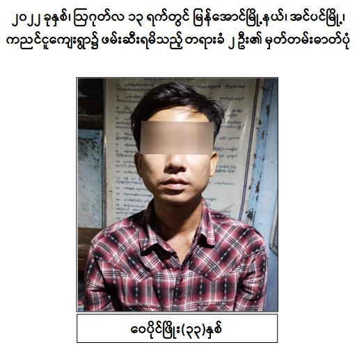 ဧရာဝတီတိုင်းဒေသကြီးအတွင်း အကြမ်းဖက်ဖောက်ခွဲဖျက်ဆီးခြင်းနှင့် အပြစ်မဲ့ပြည်သူများအား ဒလန်ဟုစွပ်စွဲ၍ အကြမ်းဖက်သတ်ဖြတ်ခြင်းတို့အား ဆောင်ရွက်နိုင်မှုမရှိစေရေး ဖော်ထုတ်ဖမ်းဆီးခြင်းများ ဆောင်ရွက်လျက်ရှိရာ အကြမ်းဖက်မှုအားမလိုလားသော ပြည်သူများ၏ သတင်းပေးပူးပေါင်းဆောင်ရွက်မှုများကြောင့် ၂၀၂၂ ခုနှစ်၊ ဩဂုတ်လ ၁၃ ရက် နေ့လယ်ပိုင်းတွင် လုံခြုံရေးပူးပေါင်းအဖွဲ့မှ မြန်အောင်မြို့နယ်အတွင်း အပြစ်မဲ့ပြည်သူများအား ဒလန်ဟုစွပ်စွဲ၍ အကြောင်းမဲ့လုပ်ကြံသတ်ဖြတ်ရာတွင် ပါဝင်ပတ်သက်သည့် တရားခံများဖြစ် သော ဝေပိုင်ဖြိုး(၃၃)နှစ်နှင့် ၎င်း၏ဇနီးဖြစ်သူ စံပယ်အောင်အောင်(၃၄)နှစ်တို့ ၂ ဦးအား မြန်အောင်မြို့နယ်၊ အင်ပင်မြို့၊ ကညင်ငူကျေးရွာရှိ ၎င်းတို့၏နေအိမ်၌ ဖမ်းဆီးရမိခဲ့သည်။