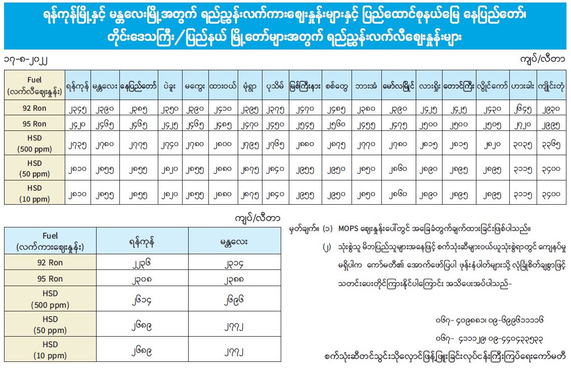 ရန်ကုန်မြို့နှင့် မန္တလေးမြို့အတွက် ရည်ညွှန်းလက်ကားဈေးနှုန်းများနှင့် ပြည်ထောင်စုနယ်မြေ နေပြည်တော်၊ တိုင်းဒေသကြီး/ပြည်နယ် မြို့တော်များအတွက် ရည်ညွှန်းလက်လီဈေးနှုန်းများ 08/17/2022