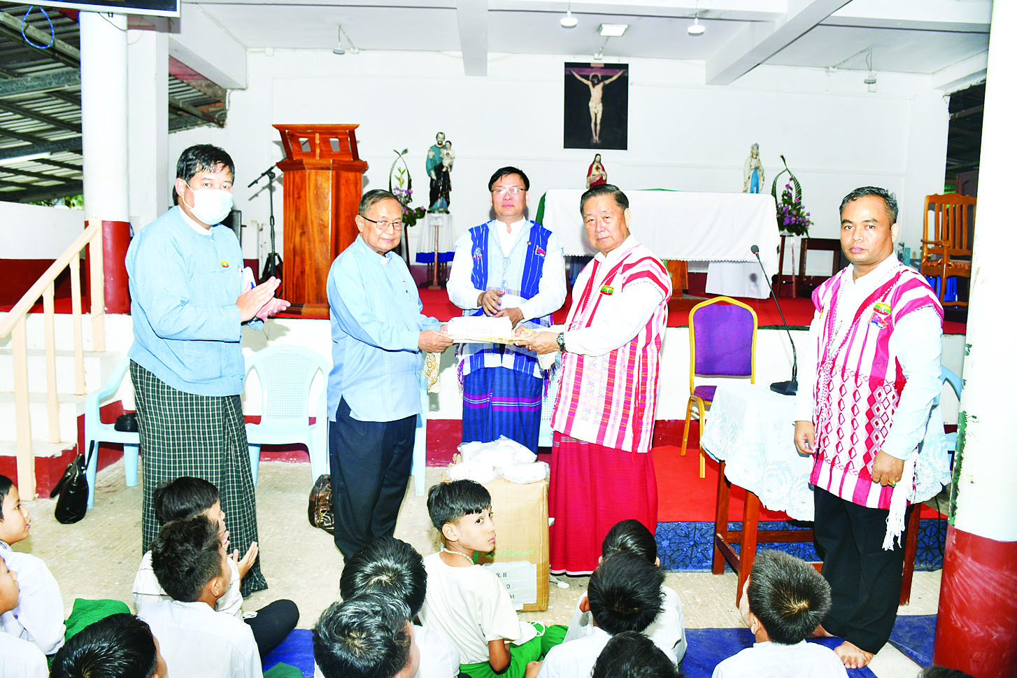 ယင်းနောက် ပြည်ထောင်စုဝန်ကြီးသည် ကက်သလစ် ခရစ်ယာန်ပရဟိတဂေဟာသို့ KN 95 Mask ၁၈၅၀ နှင့် ထောက်ပံ့ငွေကျပ် ၁၀ သိန်းကို ပေးအပ်ရာ သာသနာပိုင် ဘုန်းတော်ကြီးက လက်ခံသည်။
