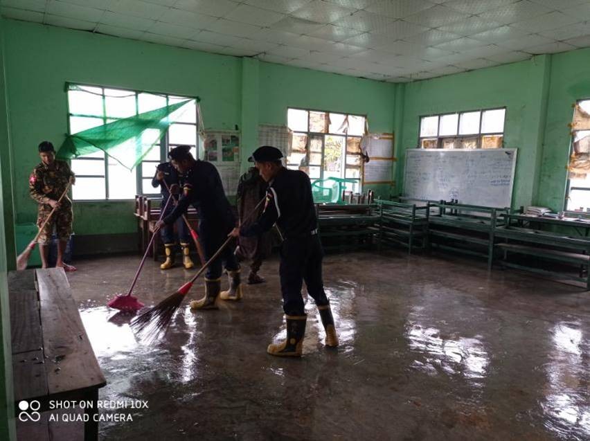 အဆိုပါ ရေဝင်ရောက်မှုများဖြစ်ပေါ်ခဲ့သည့် နေရာများတွင် ယနေ့နံနက်ပိုင်းမှစ၍ ရေများပြန်လည်ကျဆင်းသွားပြီဖြစ်သဖြင့် နယ်မြေခံတပ်မတော်သားများ၊ မြန်မာနိုင်ငံရဲတပ်ဖွဲ့ဝင်များ၊ မီးသတ်တပ်ဖွဲ့ဝင်များ၊ ဌာနဆိုင်ရာဝန်ထမ်းများနှင့် လူမှုရေးအသင်းအဖွဲ့များက လဲကျခဲ့သည့်သစ်ပင် သစ်ကိုင်းများအား ဖယ်ရှားရှင်းလင်းခြင်း၊ နေအိမ်များ၊ ဘုန်းတော်ကြီးကျောင်းများ၊ စာသင်ကျောင်းများနှင့် လမ်းများပေါ်၌ တင်ကျန်ခဲ့သည့် ရွှံ့နွံများအား ဖယ်ရှားရှင်းလင်းပေးခြင်းနှင့် လိုအပ်သည့် သန့်ရှင်းရေးလုပ်ငန်းများကို ဆောင်ရွက်ပေးကြသည်။