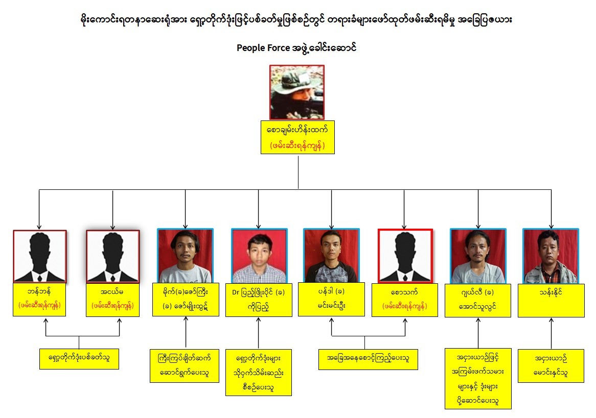 ရန်ကုန်မြို့အတွင်း အကြမ်းဖက်လုပ်ငန်းများ လုပ်ဆောင်လျက်ရှိသည့် People Force အမည်ခံ အကြမ်းဖက်အဖွဲ့အနေဖြင့် ၂၀၂၂ ခုနှစ်၊ ဖေဖော်ဝါရီလ ၁၁ ရက်တွင် ရွှေပြည်သာမြို့နယ်အတွင်းရှိ Myanmar Gi Gi စက်ရုံအား လည်းကောင်း၊ ဖေဖော်ဝါရီလ ၁၉ ရက်တွင် ဒဂုံမြို့သစ် (မြောက်ပိုင်း)မြို့နယ်ရှိ လုံခြုံရေးကင်းစခန်း ၁ ခုအားလည်းကောင်း၊ ရွှေပြည်သာမြို့နယ်ရှိ ပရဟိတအသင်းအား လည်းကောင်း လက်လုပ်ဗုံးများဖြင့် ပစ်ခတ်တိုက်ခိုက်ခြင်းများ ကျူးလွန်ခဲ့ကြောင်း ဖော်ထုတ်သိရှိရသည်။