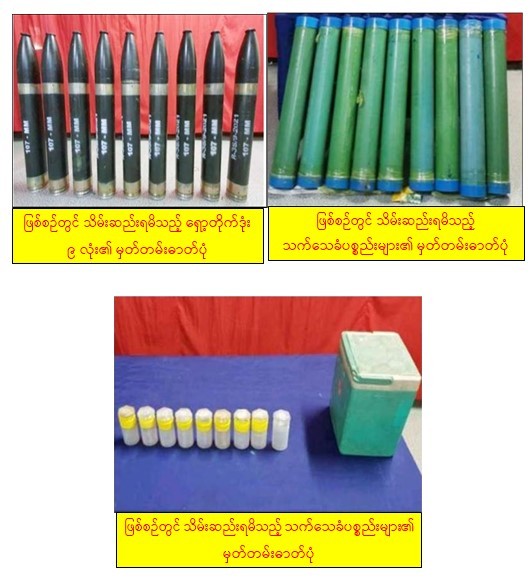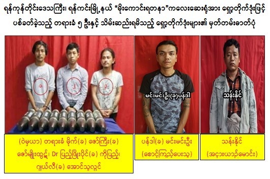 ရန်ကုန်တိုင်းဒေသကြီး၊ ရန်ကင်းမြို့နယ်ရှိ “မိုးကောင်းရတနာ”ကလေးဆေးရုံအား ရှော့တိုက်ဒုံးဖြင့် အကြမ်းဖက်ပစ်ခတ်တိုက်ခိုက်ခဲ့သည့် ဖြစ်စဉ်တွင် ပူးပေါင်းပါဝင်သူ အကြမ်းဖက်သမား ၅ ဦးအား ရှော့တိုက်ဒုံးများနှင့်အတူ ဖော်ထုတ်ဖမ်းဆီး
