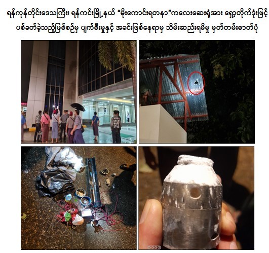 ရှော့တိုက်ဒုံးမှာ ဘောလုံးကွင်းဟောင်းခြံစည်းရိုးအနီးရှိ ကျွန်းပင်ကိုထိမှန်ခဲ့ပြီး ဆေးရုံအုတ်နံရံအား ပေါက်ကွဲစထိခိုက်ခဲ့ခြင်းဖြစ်ကြောင်းနှင့် ဘောလုံးကွင်းဟောင်းအတွင်းမှ အကြမ်းဖက်ပစ်ခတ်ရာတွင် အသုံးပြုခဲ့သည့် မီးခိုးရောင်မိုးကာအင်္ကျီ တစ်ထည်၊ ဖက်လုံးစွပ်အနီရောင် အပြဲတစ်ခု၊ ဒီဇယ်တစ်ဝက်ခန့်ပါ Alpine 350ml ရေသန့်ဘူး ၁ ဘူး၊ အနက်ရောင် မီးတိပ် ၁ ခု၊ အချင်း ၄ လက်မခန့်ရှိ သံကျွတ်အပိုင်းအစ ၁ ခု၊ အလျား ၃ ပေ၊ အချင်း ၄ လက်မခန့်ရှိ PVC ပိုက်အခြမ်း ၁ ခု၊ ဘက်ထရီအိုးခြောက်အသေး ၁ လုံးနှင့်တွဲလျက် ဒီဇယ်စိမ်ထားသည့် ကော်ခွက်ပိုင်း ၁ ခု၊ သားရေကွင်းအလွတ် ၅၀ ခန့်၊ အနီ/အနက်ရောင်ဝါယာကြိုး ၁၃ ပေခန့် ၁ ချောင်း၊ အဖြူရောင် ဆာလာအိတ် ၁ လုံး၊ အနက်ရောင် ပလတ်စတစ် ၁ ခု၊ ၂ ပေခန့်ရှိ သွပ်နန်းကြိုး ၂ ချောင်းနှင့် အဖြူရောင် Double တိပ် ၁ ခုတို့အား တွေ့ရှိသိမ်းဆည်းရမိခဲ့သဖြင့် ဥပဒေနှင့်အညီ အရေးယူနိုင်ရေး ရန်ကင်းမြို့မရဲစခန်း၌ အကြမ်းဖက်မှုတိုက်ဖျက်ရေးဥပဒေပုဒ်မ ၅၀(က)/၅၀(ည)တို့ဖြင့် အမှုဖွင့်လှစ်ကာ တရားခံဖမ်းဆီးရမိနိုင်ရေး ဆောင်ရွက်ခဲ့ပါသည်။