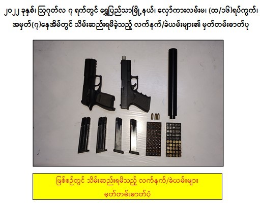 ဖမ်းဆီးရမိတရားခံ ပြည့်ဖြိုးပိုင်(ခ)ကိုပြည့်၏ ထွက်ဆိုချက်အရ အကြမ်းဖက်လုပ်ငန်းများတွင် အသုံးပြုသည့် လက်နက်/ခဲယမ်းများအား ၎င်း၏ နေအိမ်တွင်သိမ်းဆည်းထားကြောင်း ဆက်လက်ဖော်ထုတ်သိရှိရသဖြင့် ဩဂုတ်လ ၇ ရက်နေ့ ည ၈ နာရီအချိန်တွင် ၎င်း၏ နေအိမ်အိပ်ခန်း အတွင်း ထပ်မံသွားရောက်ရှာဖွေခဲ့ရာ Sigsauer ပစ္စတို ၁ လက်၊ ၎င်းကျည်အိမ် ၂ ခု၊ Glock ပစ္စတို ၁ လက်၊ ၎င်းကျည်အိမ် ၂ ခု၊ ပွိုင့်-၃၈၀ ကျည် ၇၅ တောင့်၊ ၉ မမ ကျည် ၅၀ တောင့်၊ အသံတိတ်ပြောင်း ၁ ခုတို့အား လည်းကောင်း ထပ်မံသိမ်းဆည်းရမိခဲ့သည်။