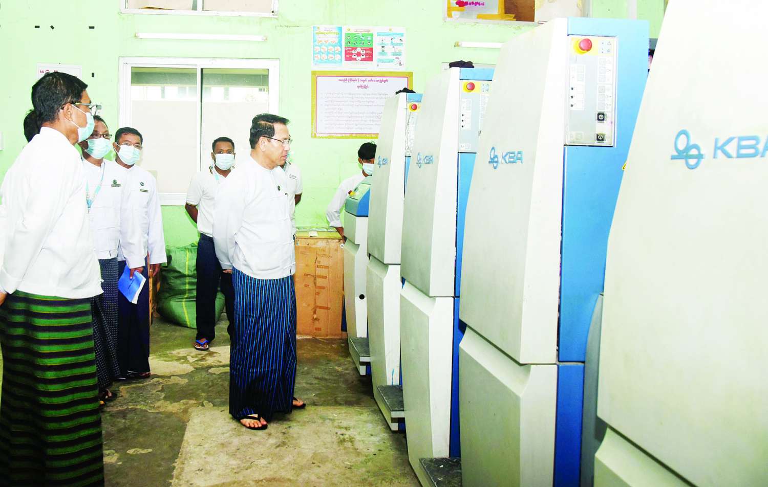 ယင်းနောက် နေပြည်တော်ပုံနှိပ်စက်ရုံအတွင်း တပ်ဆင်ထားသည့် ပုံနှိပ်စက်များ၊ စက္ကူနှင့်ဓာတုပစ္စည်းများ သိုလှောင်ထား ရှိမှု၊ စက္ကူဖြတ်စက်၊ စာအုပ်ချုပ် စက်နှင့်ကော်ကပ်စက်များကို လှည့်လည်ကြည့်ရှုသည်။