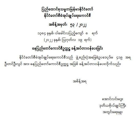 ပုံနှိပ်ခြင်းနှင့်ထုတ်ဝေခြင်းလုပ်ငန်းဥပဒေနှင့်အညီ စာအုပ်စာစောင်များ ပေးအပ်ရန် အသိပေးကြေညာချက်