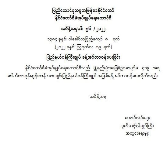 ပုံနှိပ်ခြင်းနှင့်ထုတ်ဝေခြင်းလုပ်ငန်းဥပဒေနှင့်အညီ စာအုပ်စာစောင်များ ပေးအပ်ရန် အသိပေးကြေညာချက်
