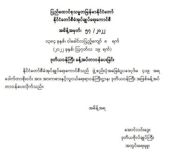 ပုံနှိပ်ခြင်းနှင့်ထုတ်ဝေခြင်းလုပ်ငန်းဥပဒေနှင့်အညီ စာအုပ်စာစောင်များ ပေးအပ်ရန် အသိပေးကြေညာချက်