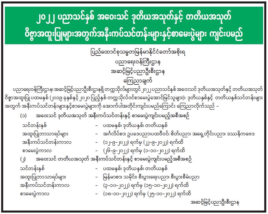 ၂၀၂၂ ပညာသင်နှစ် အဝေးသင် ဒုတိယအသုတ်နှင့် တတိယအသုတ် ဝိဇ္ဇာအထူးပြုများအတွက် အနီးကပ်သင်တန်းများနှင့်စာမေးပွဲများ ကျင်းပမည် 08/20/2022