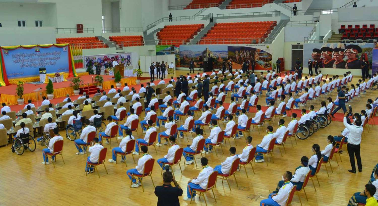 အင်ဒိုနီးရှားနိုင်ငံ၌ ကျင်းပသည့် (၁၁)ကြိမ်မြောက် အာဆီယံမသန်စွမ်းသူများ အားကစားပြိုင်ပွဲတွင် ဆုတံဆိပ်ရရှိခဲ့သော မြန်မာအားကစားအဖွဲ့များအား နိုင်ငံတော်က ဂုဏ်ပြုဆုချီးမြှင့်ခြင်းအခမ်းအနားကို ယနေ့မွန်းလွဲပိုင်းတွင် နေပြည်တော်ရှိ ဝဏ္ဏသိဒ္ဓိ အားကစားရုံ(B)၌ ကျင်းပရာ နိုင်ငံတော်စီမံအုပ်ချုပ်ရေးကောင်စီဥက္ကဋ္ဌ နိုင်ငံတော်ဝန်ကြီးချုပ် ဗိုလ်ချုပ်မှူးကြီးမင်းအောင်လှိုင် တက်ရောက်အမှာစကားပြောကြားပြီး ဂုဏ်ပြုဆုငွေများ ပေးအပ်ချီးမြှင့်သည်။