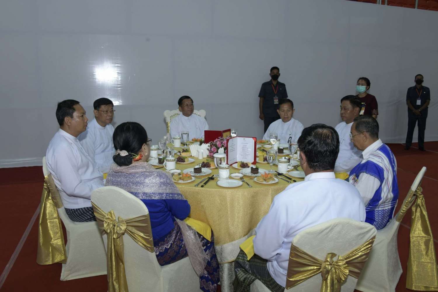 ယင်းနောက် နိုင်ငံတော်စီမံအုပ်ချုပ်ရေးကောင်စီဥက္ကဋ္ဌ၊ နိုင်ငံတော်ဝန်ကြီးချုပ်နှင့် အဖွဲ့ဝင်များသည် နိုင်ငံ့ဂုဏ်ဆောင်အားကစားသမားများနှင့် နည်းပြများကို ရင်းရင်းနှီးနှီး နှုတ်ဆက်၍ ဂုဏ်ပြုလက်ဖက်ရည်ဝိုင်းဖြင့် တည်ခင်းဧည့်ခံခဲ့ကြောင်းသတင်းရရှိသည်။