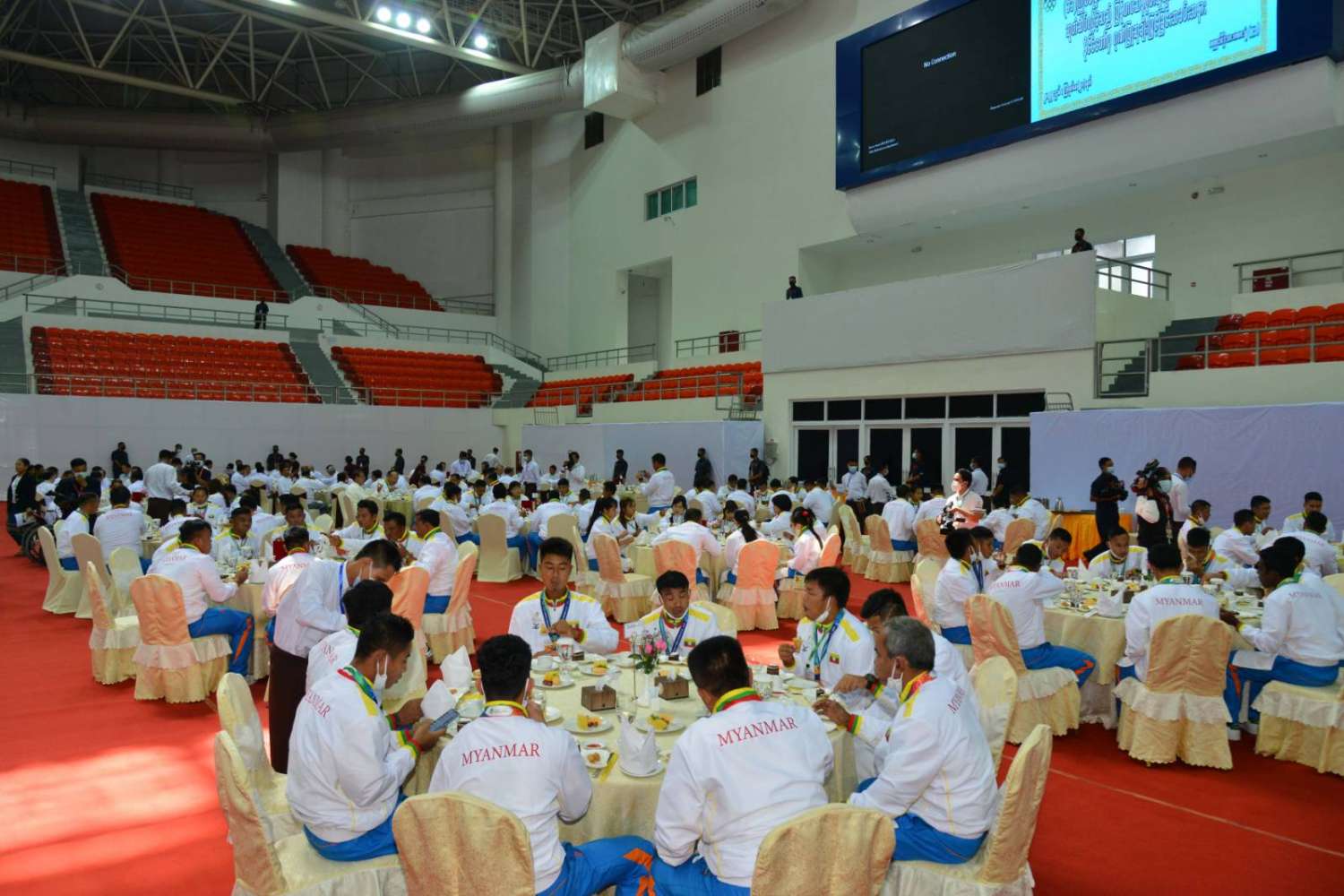 အခမ်းအနားသို့ နိုင်ငံတော်စီမံအုပ်ချုပ်ရေးကောင်စီဥက္ကဋ္ဌ နိုင်ငံတော်ဝန်ကြီးချုပ်နှင့်အတူ ကောင်စီဒုတိယဥက္ကဋ္ဌ ဒုတိယဝန်ကြီးချုပ် ဒုတိယဗိုလ်ချုပ်မှူးကြီး စိုးဝင်း၊ နိုင်ငံတော်စီမံအုပ်ချုပ်ရေးကောင်စီအဖွဲ့ဝင်များ၊ ပြည်ထောင်စုအဆင့်ပုဂ္ဂိုလ်များ၊ ပြည်ထောင်စုဝန်ကြီးများ၊ နေပြည်တော်ကောင်စီဥက္ကဋ္ဌ၊ ကာကွယ်ရေးဦးစီးချုပ်ရုံးမှ တပ်မတော်အရာရှိကြီးများ၊ နေပြည်တော်တိုင်းစစ်ဌာနချုပ် တိုင်းမှူး၊ ဒုတိယဝန်ကြီးများ၊ မြန်မာနိုင်ငံအားကစားအဖွဲ့ချုပ်များမှ ဥက္ကဋ္ဌများ၊ ဒုတိယဥက္ကဋ္ဌများ၊ ဖိတ်ကြားထားသူများ၊ နိုင်ငံ့ဂုဏ်ဆောင်အားကစားသမားများ၊ အုပ်ချုပ်သူများ၊ နည်းပြများနှင့် တာဝန်ရှိသူများ တက်ရောက်ကြသည်။