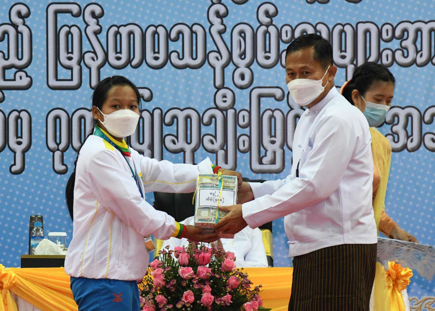 ယင်းနောက် နိုင်ငံတော်စီမံအုပ်ချုပ်ရေးကောင်စီဒုတိယဥက္ကဋ္ဌ ဒုတိယဝန်ကြီးချုပ်က ငွေတံဆိပ်ဆုရရှိခဲ့ကြသည့် ပြေးခုန်ပစ်အားကစားနည်းမှ မီတာ ၁၀၀ အပြေးပြိုင်ပွဲနှင့် အလျားခုန်ပြိုင်ပွဲတွင် ငွေတံဆိပ် ၂ ခု ရရှိခဲ့သည့် အားကစားသမား မလော်လာဝင်း ကိုလည်းကောင်း၊ အလေးမအားကစားနည်းမှ ၈၆ ကီလိုတန်းပြိုင်ပွဲနှင့် အကောင်းဆုံး ပါဝင်ယှဉ်ပြိုင်မှုတွင် ငွေတံဆိပ် ၂ ခု ရရှိခဲ့သည့် အားကစားသမား မငြိမ်းစန္ဒာအောင်ကိုလည်းကောင်း၊ ပြေးခုန်ပစ်အားကစားနည်းမှ သံလုံးပစ်ပြိုင်ပွဲတွင် ငွေတံဆိပ် ၁ ခု၊ လှံတံပစ်နှင့် သံပြားပစ်ပြိုင်ပွဲတွင် ကြေးတံဆိပ် ၂ ခု ရရှိခဲ့သည့် အားကစားသမား ဒုတပ်ကြပ် အောင်ထွန်းလင်းကိုလည်းကောင်း၊ ပြေးခုန်ပစ်အားကစားနည်းမှ လှံတံပစ် ပြိုင်ပွဲတွင် ငွေတံဆိပ် ၁ ခုနှင့် အမြင့်ခုန်ပြိုင်ပွဲတွင် ကြေးတံဆိပ် ၁ ခု ရရှိခဲ့သည့် ဒုတပ်ကြပ် စိုးသန်း ကိုလည်းကောင်း၊ ပြေးခုန်ပစ်အားကစားနည်းမှ မီတာ ၁၀၀ အပြေးပြိုင်ပွဲတွင် ငွေတံဆိပ် ၁ ခုနှင့် မီတာ ၄၀၀ အပြေးပြိုင်ပွဲတွင် ကြေးတံဆိပ် ၁ ခု ရရှိခဲ့သည့် အားကစားသမား မနန္ဒာလင်းကိုလည်းကောင်း ဂုဏ်ပြုချီးမြှင့်ငွေများ ပေးအပ်ချီးမြှင့်သည်။
