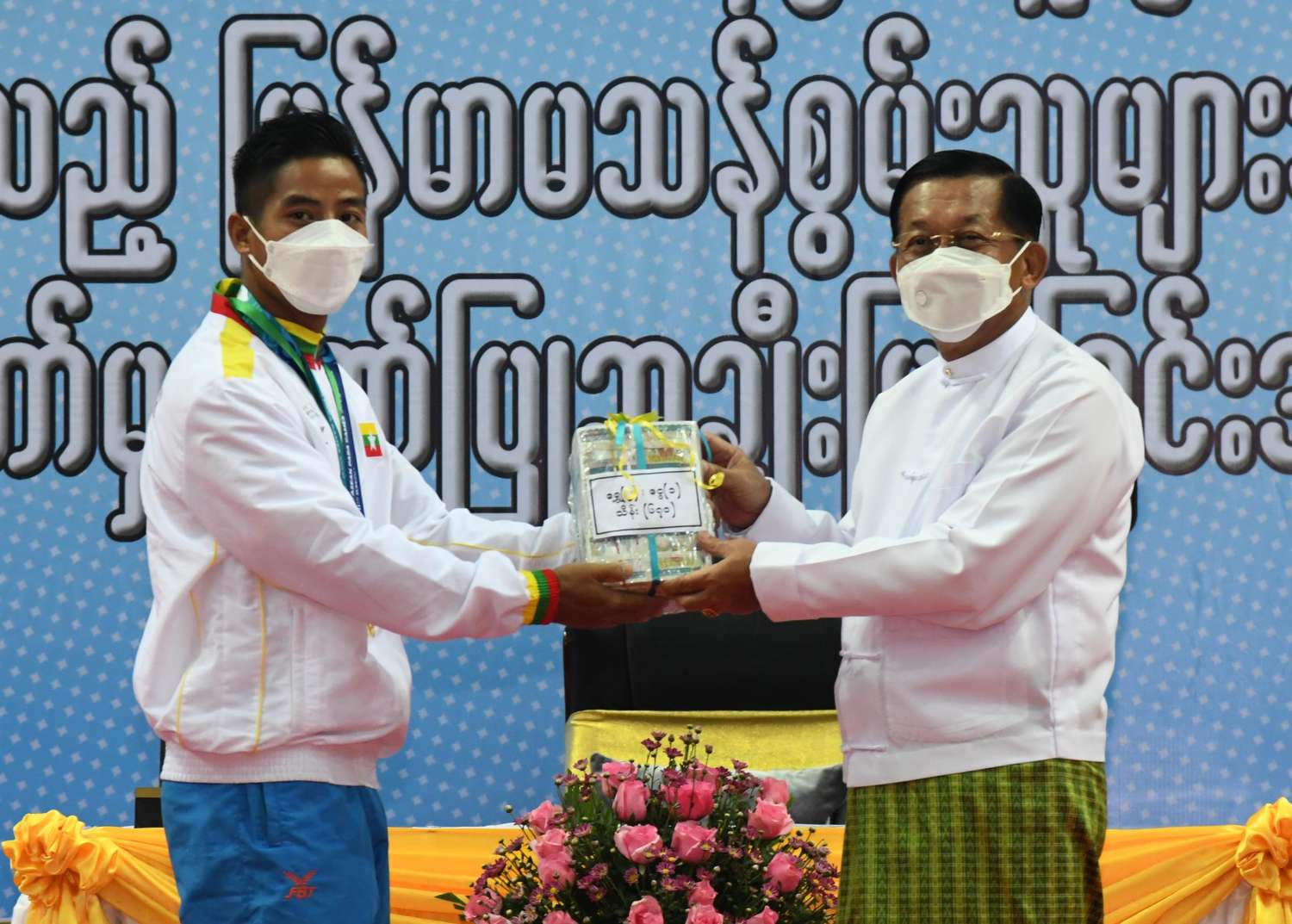 ထို့နောက် (၁၁)ကြိမ်မြောက် အာဆီယံမသန်စွမ်းသူများ အားကစားပြိုင်ပွဲတွင် ဆုတံဆိပ်ရရှိခဲ့သည့် နိုင်ငံ့ဂုဏ်ဆောင် ဆုရအားကစားသမားများ၊ နည်းပြများနှင့် အုပ်ချုပ်သူများကို ဂုဏ်ပြုဆုငွေများ ပေးအပ်ချီးမြှင့်ရာ နိုင်ငံတော်စီမံအုပ်ချုပ်ရေးကောင်စီဥက္ကဋ္ဌ နိုင်ငံတော်ဝန်ကြီးချုပ်က ရွှေတံဆိပ်ဆုရရှိခဲ့ကြသည့် ပြေးခုန်ပစ်အားကစားနည်းမှ မီတာ ၁၀၀ နှင့် မီတာ ၂၀၀ အပြေးပြိုင်ပွဲတွင် ရွှေတံဆိပ် ၂ ခုနှင့် အသင်းလိုက်မီတာ ၄၀၀ လက်ဆင့်ကမ်းအပြေးပြိုင်ပွဲတွင် ငွေတံဆိပ် ၁ ခု ရရှိခဲ့သည့် အားကစားသမား ဒုတပ်ကြပ် စိုးပေ ကိုလည်းကောင်း၊ ပြေးခုန်ပစ်အားကစားနည်းမှ သံပြားပစ်နှင့် သံလုံးပစ်ပြိုင်ပွဲတွင် ရွှေတံဆိပ် ၂ ခုနှင့် လှံတံပစ်ပြိုင်ပွဲတွင် ကြေးတံဆိပ်၁ ခု ရရှိခဲ့သည့် အားကစားသမား မထက်ထက်အေးကို လည်းကောင်း၊ ရေကူး အားကစားနည်းမှ မီတာ ၂၀၀ အလွတ်ကူးနှင့် မီတာ ၁၀၀ ပတ်လည်ကူးပြိုင်ပွဲတွင် ရွှေတံဆိပ် ၂ ခုနှင့် မီတာ ၅၀ အလွတ်ကူးပြိုင်ပွဲတွင် ကြေးတံဆိပ် ၁ ခု ရရှိခဲ့သည့် အားကစားသမား မောင်အောင်မြင့်မြတ် ကိုလည်းကောင်း၊ ပြေးခုန်ပစ်အားကစားနည်းမှ သံလုံးပစ်နှင့် သံပြားပစ်ပြိုင်ပွဲတွင် ရွှေတံဆိပ် ၂ ခု ရရှိခဲ့သည့် အားကစားသမား မောင်အောင်ဘုန်းမြတ် ကိုလည်းကောင်း၊ ပြေးခုန်ပစ်အားကစားနည်းမှ မီတာ ၄၀၀ အပြေးပြိုင်ပွဲတွင်ရွှေတံဆိပ် ၁ ခု၊ အသင်းလိုက် မီတာ ၄၀၀ လက်ဆင့်ကမ်းအပြေး ပြိုင်ပွဲတွင် ငွေတံဆိပ် ၁ ခုနှင့် မီတာ ၂၀၀ အပြေးပြိုင်ပွဲတွင် ကြေးတံဆိပ် ၁ ခု ရရှိခဲ့သည့် အားကစားသမား အရာခံဗိုလ် ကျော်ကျော်ဝင်းကိုလည်းကောင်း၊ ပြေးခုန်ပစ်အားကစားနည်းမှ သံလုံးပစ်ပြိုင်ပွဲ တွင် ရွှေတံဆိပ် ၁ ခုနှင့် သံပြားပစ်ပြိုင်ပွဲတွင် ငွေတံဆိပ် ၁ ခုရရှိခဲ့သည့် အားကစားသမား ဒုတပ်ကြပ် ဇော်မင်းလွင်ကိုလည်းကောင်း၊ ရေကူးအားကစားနည်းမှ မီတာ ၁၀၀ ရင်ဘောင်တန်းကူးပြိုင်ပွဲနှင့် မီတာ ၅၀ အလွတ်ကူးပြိုင်ပွဲတွင် ရွှေတံဆိပ် ၁ ခုနှင့် ငွေတံဆိပ် ၁ ခုရရှိခဲ့သည့် အားကစားသမား မောင်အောင်ဖုန်းကိုလည်းကောင်း၊ ရေကူးအားကစားနည်းမှ မီတာ ၅၀ ပတ်လည် ကူးပြိုင်ပွဲတွင် ရွှေတံဆိပ် ၁ ခုနှင့် မီတာ၅၀ လိပ်ပြာကူးပြိုင်ပွဲတွင် ငွေတံဆိပ် ၁ ခု ရရှိခဲ့သည့် အားကစားသမား မောင်ကျော်ထူးကိုလည်းကောင်း၊ ပြေးခုန်ပစ် အားကစားနည်းမှ လှံတံပစ်ပြိုင်ပွဲတွင် ရွှေတံဆိပ်(၁)ခုနှင့် သံလုံးပစ်ပြိုင်ပွဲတွင် ကြေးတံဆိပ် ၁ ခုရရှိခဲ့သည့် အားကစားသမား တပ်ကြပ်တင်ညိုကိုလည်းကောင်း၊ ရေကူးအားကစားနည်းမှ မီတာ ၁၀၀ ရင်ဘောင်တန်းကူး ပြိုင်ပွဲတွင် ရွှေတံဆိပ် ၁ ခု ရရှိခဲ့သည့် အားကစားသမား မောင်နန္ဒာစိုးမင်းကိုလည်းကောင်း ဂုဏ်ပြုချီးမြှင့်ငွေများ ပေးအပ်ချီးမြှင့်သည်။