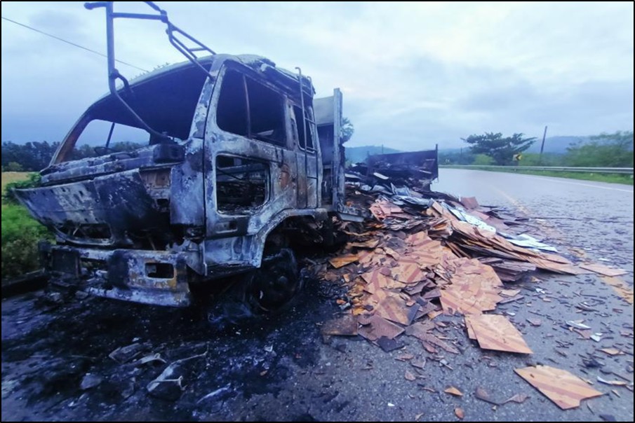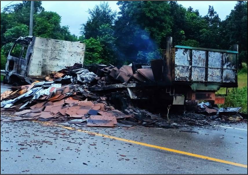 ကရင်ပြည်နယ်၊ ကော့ကရိတ်မြိုနယ်၊ ရွာသစ်ကုန်းကျေးရွာ၏ အနောက်ဘက် မီတာ ၁၀၀ ခန့်အကွာရှိ ကော့ကရိတ်- မြဝတီသွား အာရှလမ်းသစ်၌ ဩဂုတ် ၁၉ ရက် ည ၈ နာရီ ၁၅ မိနစ်ခန့်တွင်အိမ်ဆောက်ကြွေပြားများတင်ဆောင်ပြီး မြဝတီမြို့မှ မော်လမြိုင်မြို့သို့ ပို့ဆောင်ရန် ထွက်ခွာလာသည့် NISSAN အမျိုးအစား ၁၀ ဘီးမော်တော်ယာဉ် ၁ စီးအားလမ်း၏ တောင်ဘက် မီတာ ၂၀၀ ခန့်အကွာမှ KKO (ခွဲထွက်)အဖွဲ့နှင့် PDF အမည်ခံအကြမ်းဖက်သမားများက လက်နက်ငယ်များဖြင့် ပစ်ခတ်ရပ်တန့်စေပြီး မော်တော်ယာဉ်အား မီးရှို့ဖျက်ဆီးခဲ့ကြောင်းသိရှိရသည်။