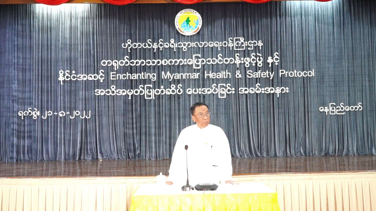 “နေ့စဉ်သုံး အခြေခံတရုတ်ဘာသာစကားပြော သင်တန်းဖွင့်ပွဲနှင့် နိုင်ငံအဆင့် Enchanting Myanmar Health & Safety Protocols အသိအမှတ်ပြု တံဆိပ်ပေးအပ်ခြင်း အခမ်းအနား” ကို ယနေ့နံနက်ပိုင်းတွင် ဟိုတယ်နှင့်ခရီးသွားလာရေးဝန်ကြီးဌာန ကျောက်စိမ်းခန်းမ၌ ကျင်းပသည်။
