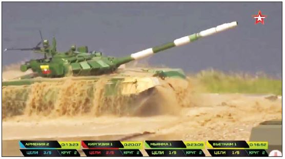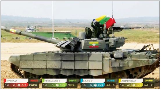 မြန်မာ့တပ်မတော် တင့်တပ်ဖွဲ့အနေဖြင့် Tank Biathlon (Tank Crews Competition) Division-2 ၌ ဆီးရီးယား၊ လာအို၊ အီရန်၊ တာဂျစ်ကစ္စတန်၊ တောင်အာဆက်တီးယား၊ အာခါ့ဇီယာ၊ ဆူဒန်၊ ဇင်ဘာဘွေ၊ အာမေးနီးယားနှင့် မာလီနိုင်ငံတို့မှ တင့်တပ်ဖွဲ့ဝင်များနှင့်အတူ မိုင်ကုန်မောင်းနှင်၍ စံချိန်ယူခြင်း၊ ၁၂၅မီလီမီတာ အမြောက်အား ရပ်လျက်ကျည် ၃ တောင့်ပစ်ခတ်ခြင်း၊ ၁၂ ဒသမ ၇ မီလီမီတာ လေယာဉ်ပစ်စက် သေနတ်ကျည် ၁၅တောင့် ရပ်လျက်ပစ်ခတ်ခြင်း၊ ၇ ဒသမ ၆၂ မီလီမီတာယှဉ်တွဲစက် သေနတ်ကျည် ၁၅ တောင့် ရပ်လျက်ပစ်ခတ်ခြင်းတို့ကို ယှဉ်ပြိုင်ခဲ့ပြီး မြန်မာ့တပ်မတော်တင့်တပ်ဖွဲ့ Crew- 1 အနေဖြင့် ပြိုင်ပွဲဝင်စံချိန် ၂၇ မိနစ် ၄၃ စက္ကန့်ဖြင့်လည်းကောင်း၊ Crew-2 အနေဖြင့် ပြိုင်ပွဲဝင်စံချိန် ၃၈ မိနစ် ၁၄ စက္ကန့်ဖြင့်လည်းကောင်း၊ Crew–3 အနေဖြင့် ပြိုင်ပွဲဝင်စံချိန် ၃၀ မိနစ် ၂၈ စက္ကန့်ဖြင့်လည်းကောင်း၊ စုစုပေါင်း ပြိုင်ပွဲဝင်စံချိန် ၁ နာရီ ၃၆ မိနစ် ၂၅ စက္ကန့် ရရှိခဲ့ပြီး စုစုပေါင်းပစ်မှတ် ၁၅ ခုတွင် ၁၄ ခုကို ထိမှန်ခဲ့ကာ ပြိုင်ပွဲဝင် ၁၁ သင်း ယှဉ်ပြိုင်ခဲ့ရာတွင် ပထမဆုကို ထိုက်ထိုက်တန်တန် ဆွတ်ခူးရရှိခဲ့သည်။